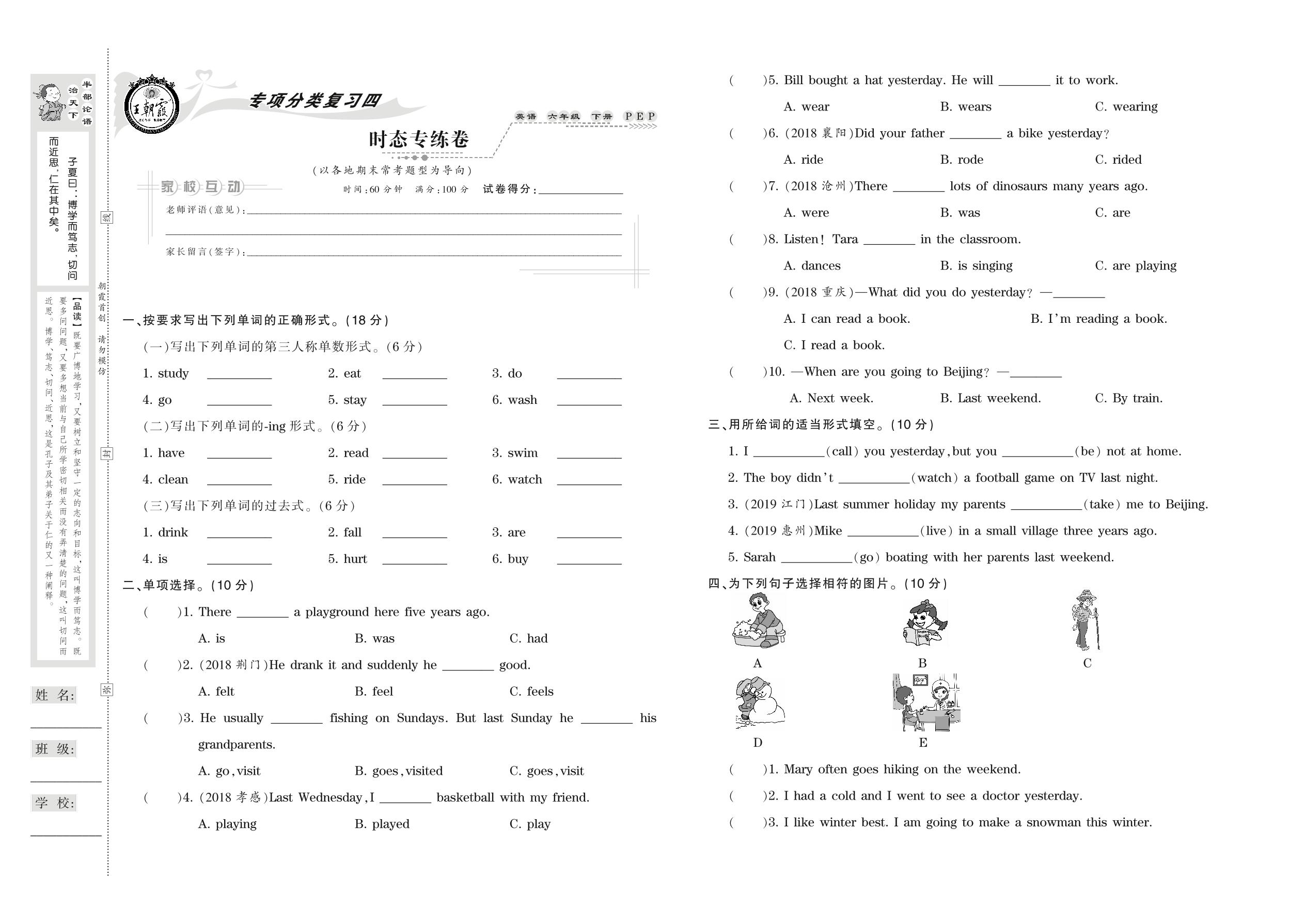 六年级英语人教PEP版(三起始)下册专项卷