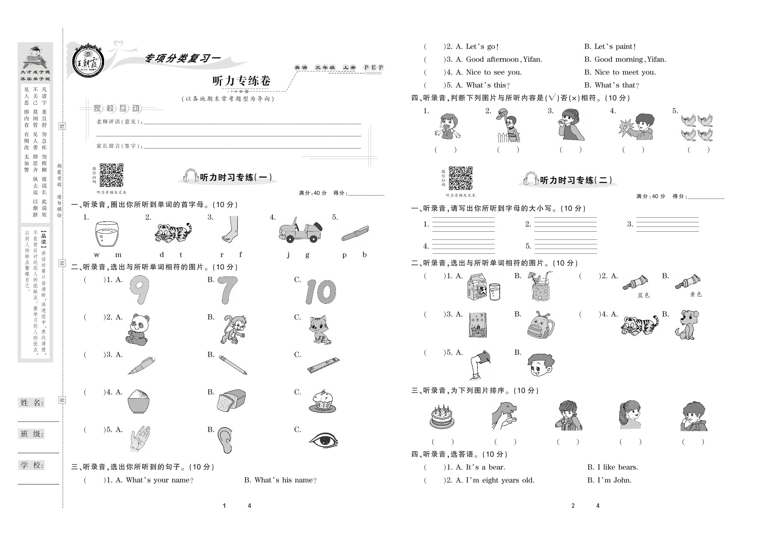 2020上册三年级英语PEP版 听力专练卷