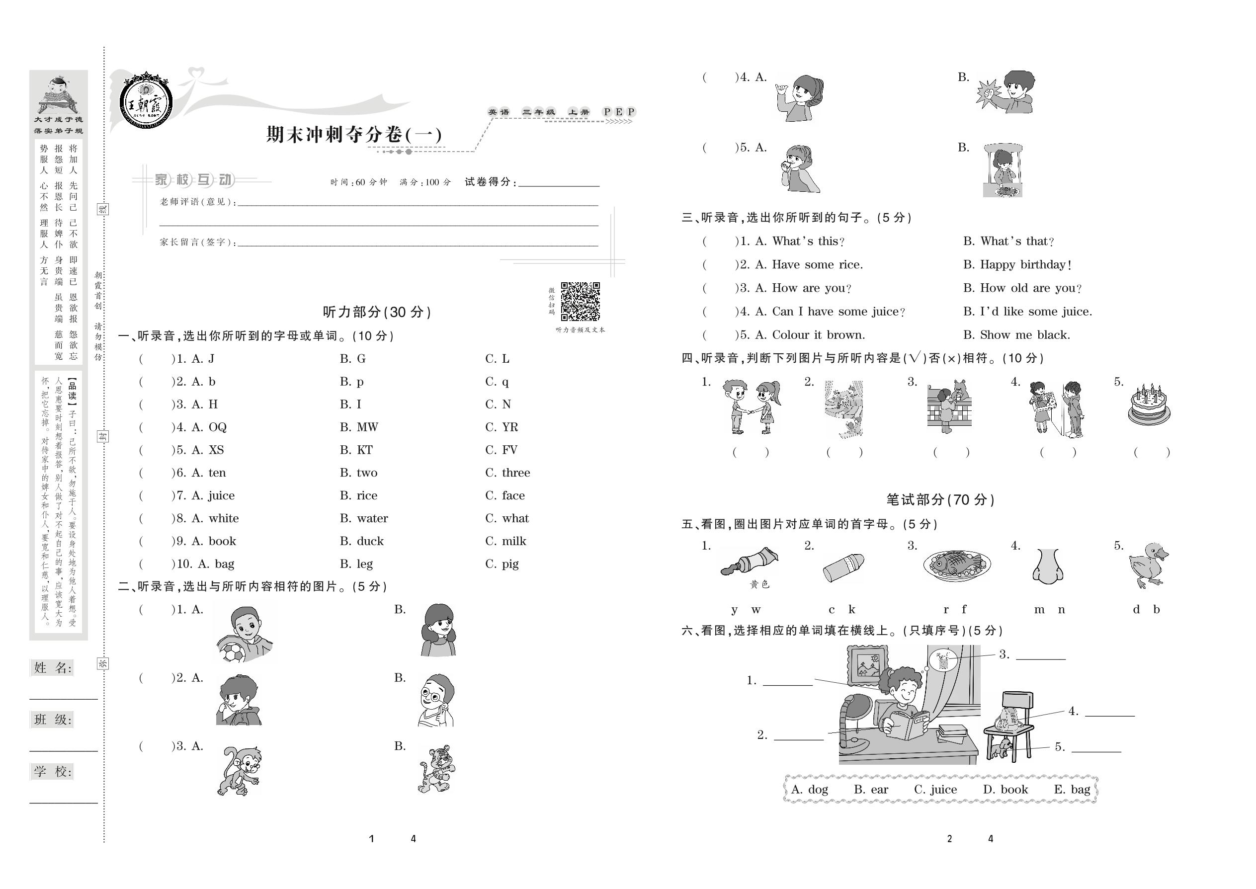 2020上册三年级英语PEP版 期末冲刺夺分卷(一)
