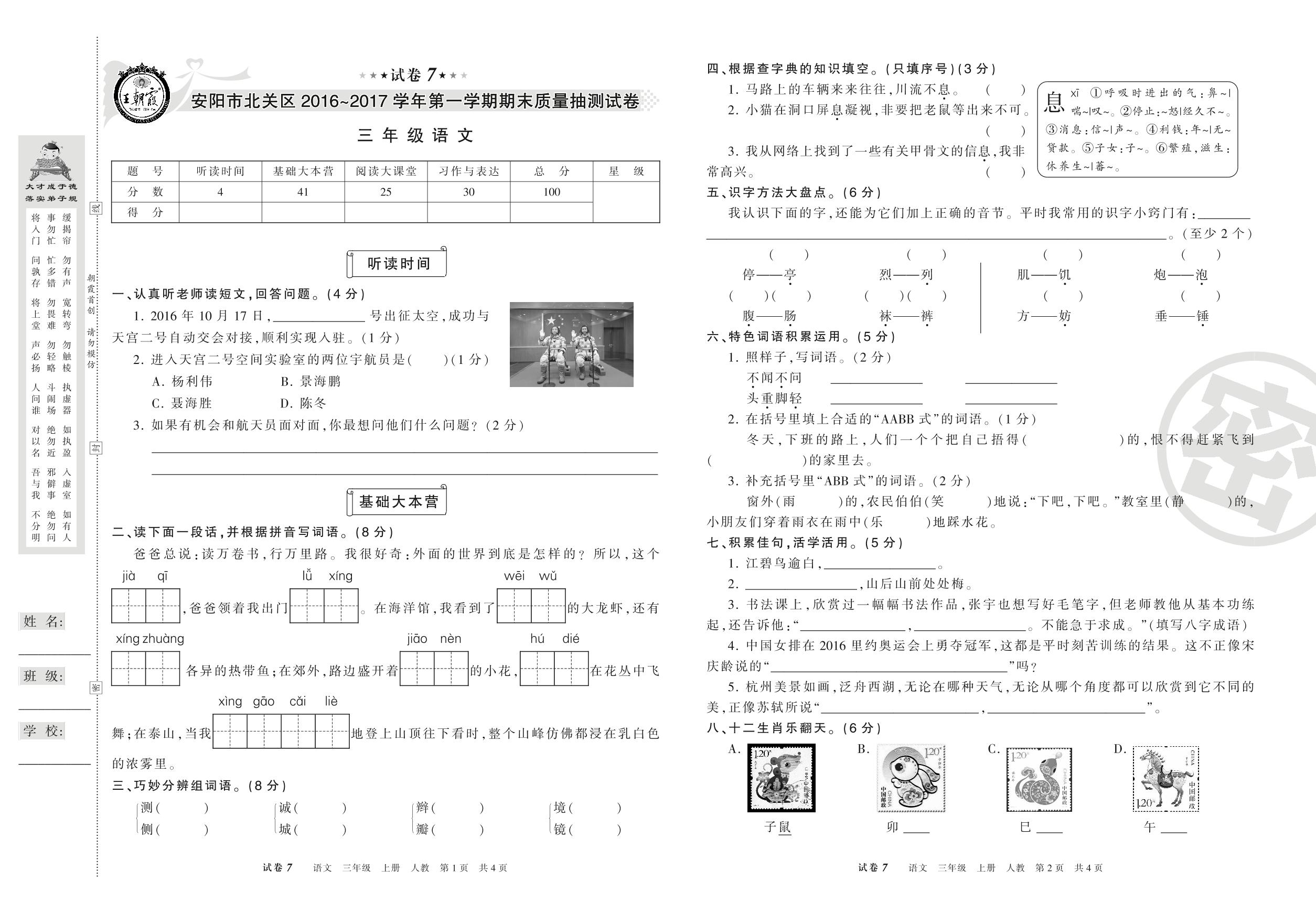 2016-2017学年第一学期安阳市北关区三年级语文试卷(人教版)【7】