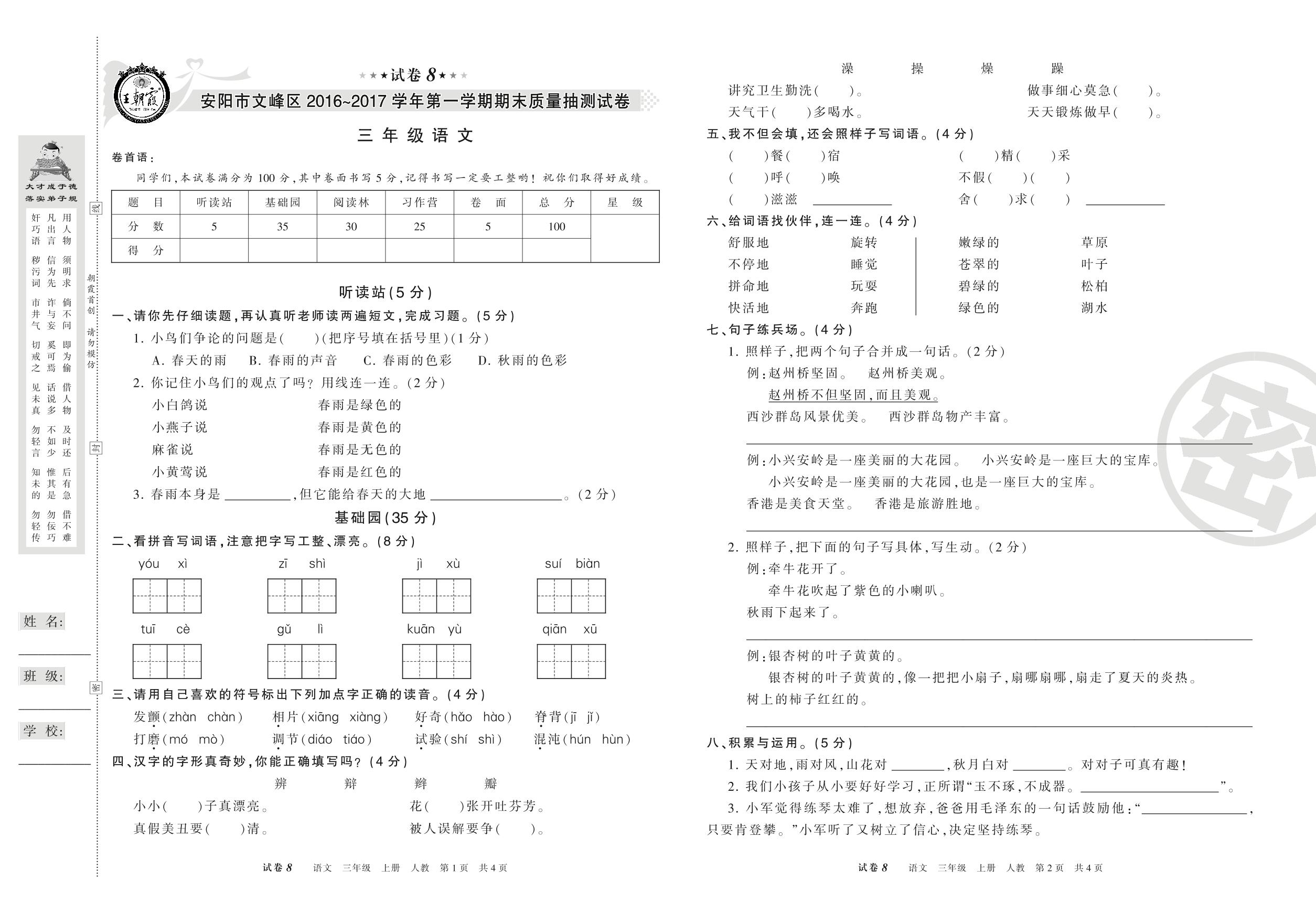 2016-2017学年第一学期安阳市文峰区三年级语文试卷(人教版)【8】