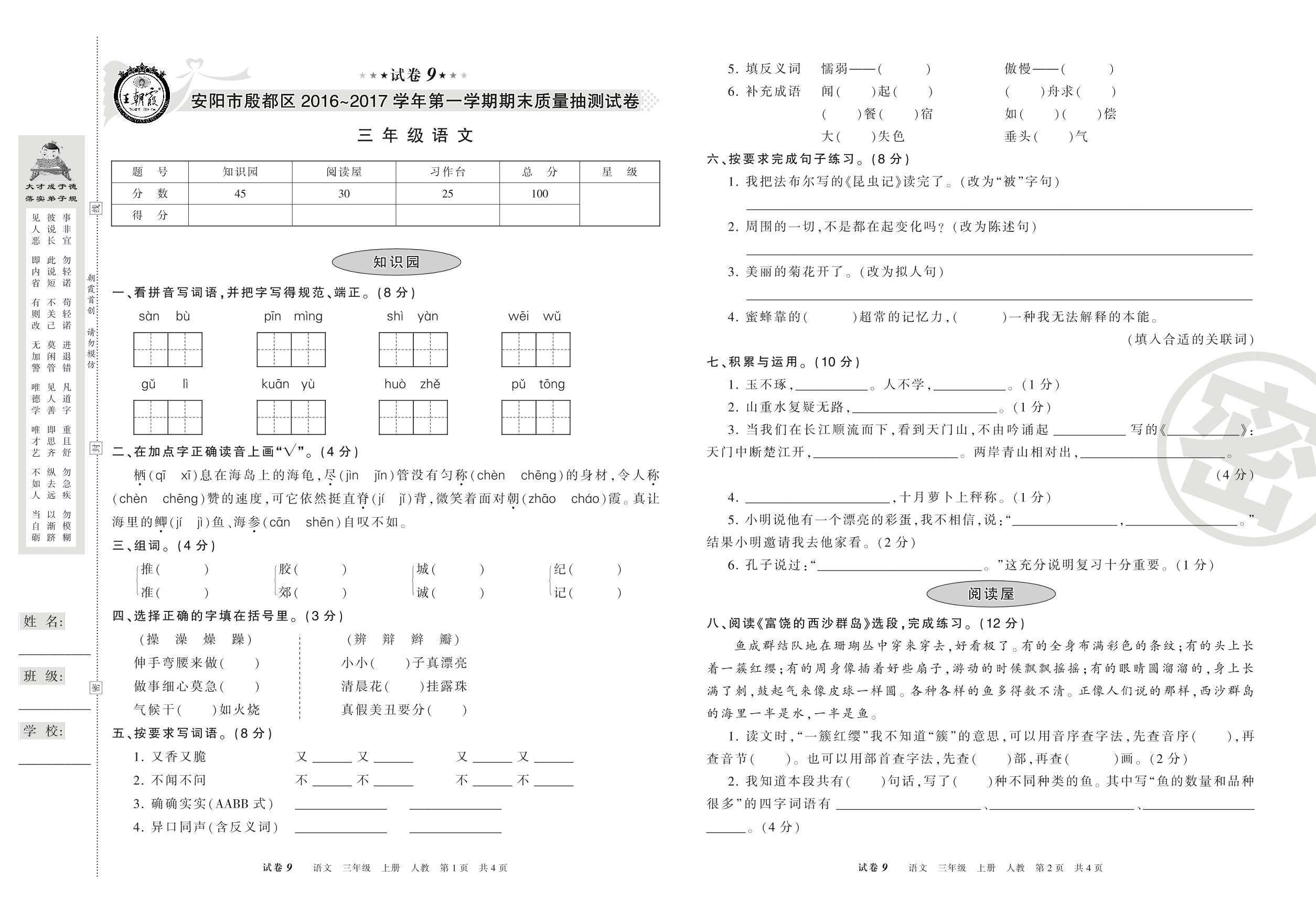 2016-2017学年第一学期安阳市殷都区三年级语文试卷(人教版)【9】