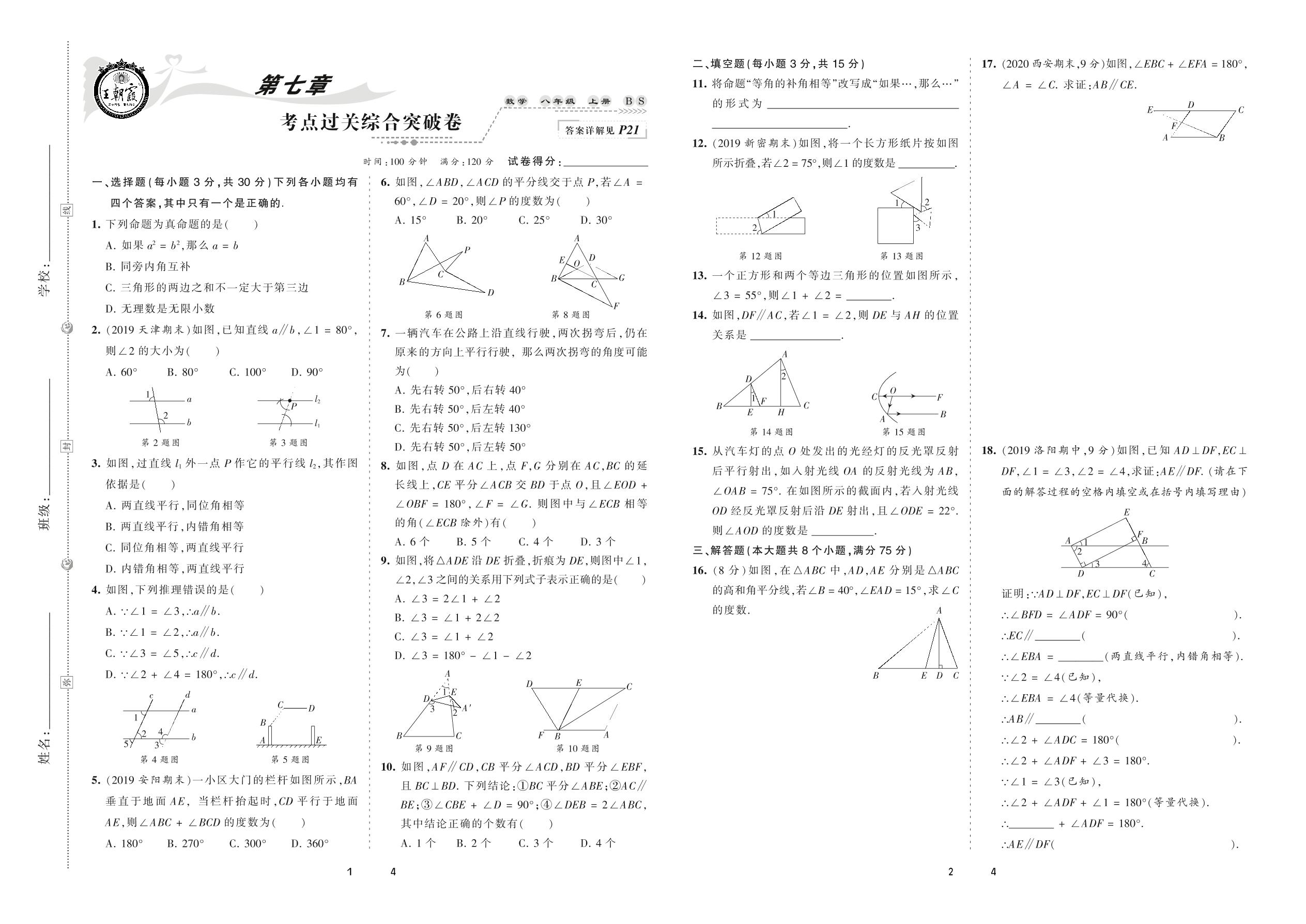 2020上册八年级数学北师版 第七章 考点过关综合突破卷