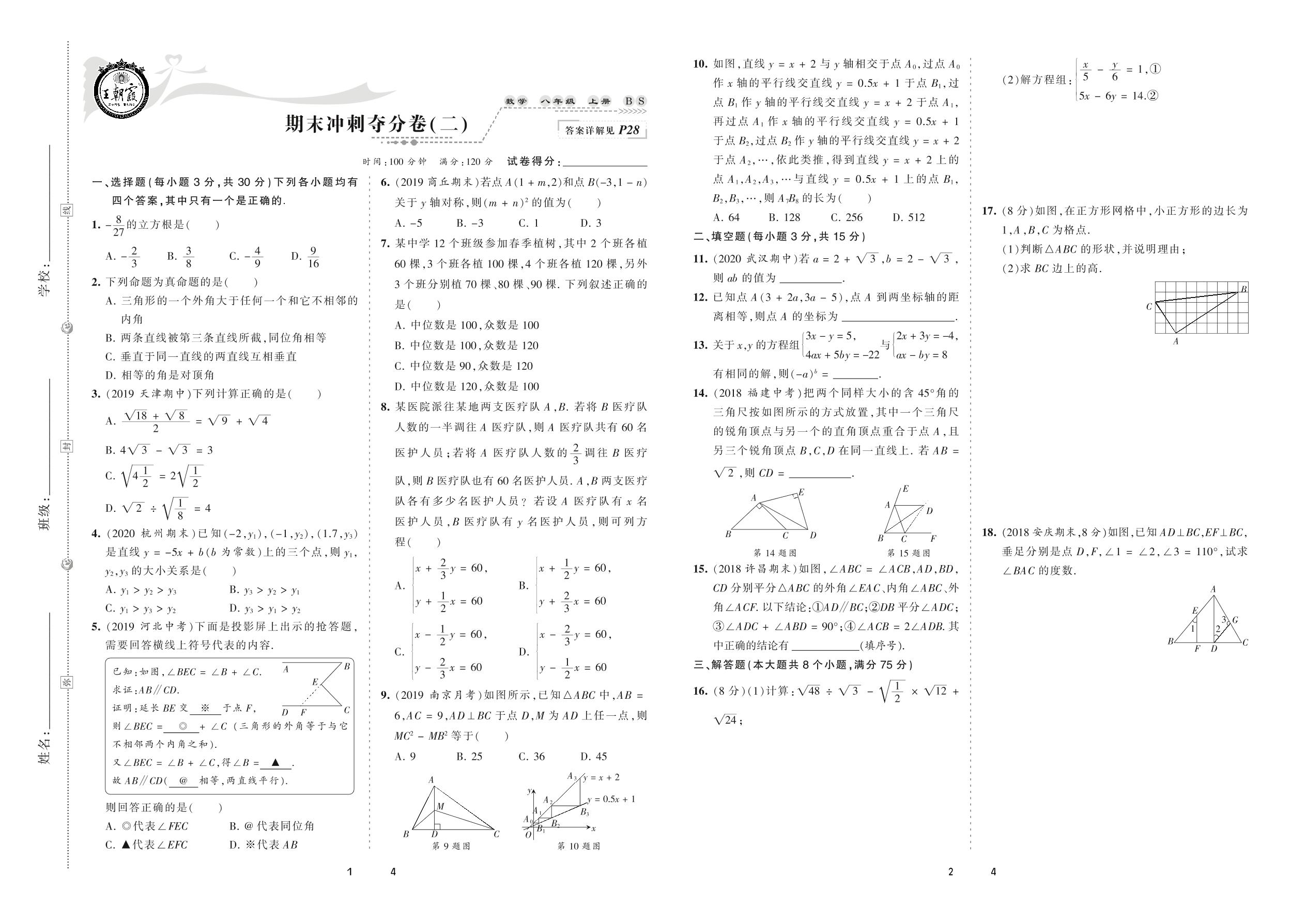 2020上册八年级数学北师版 期末冲刺夺分卷(二)