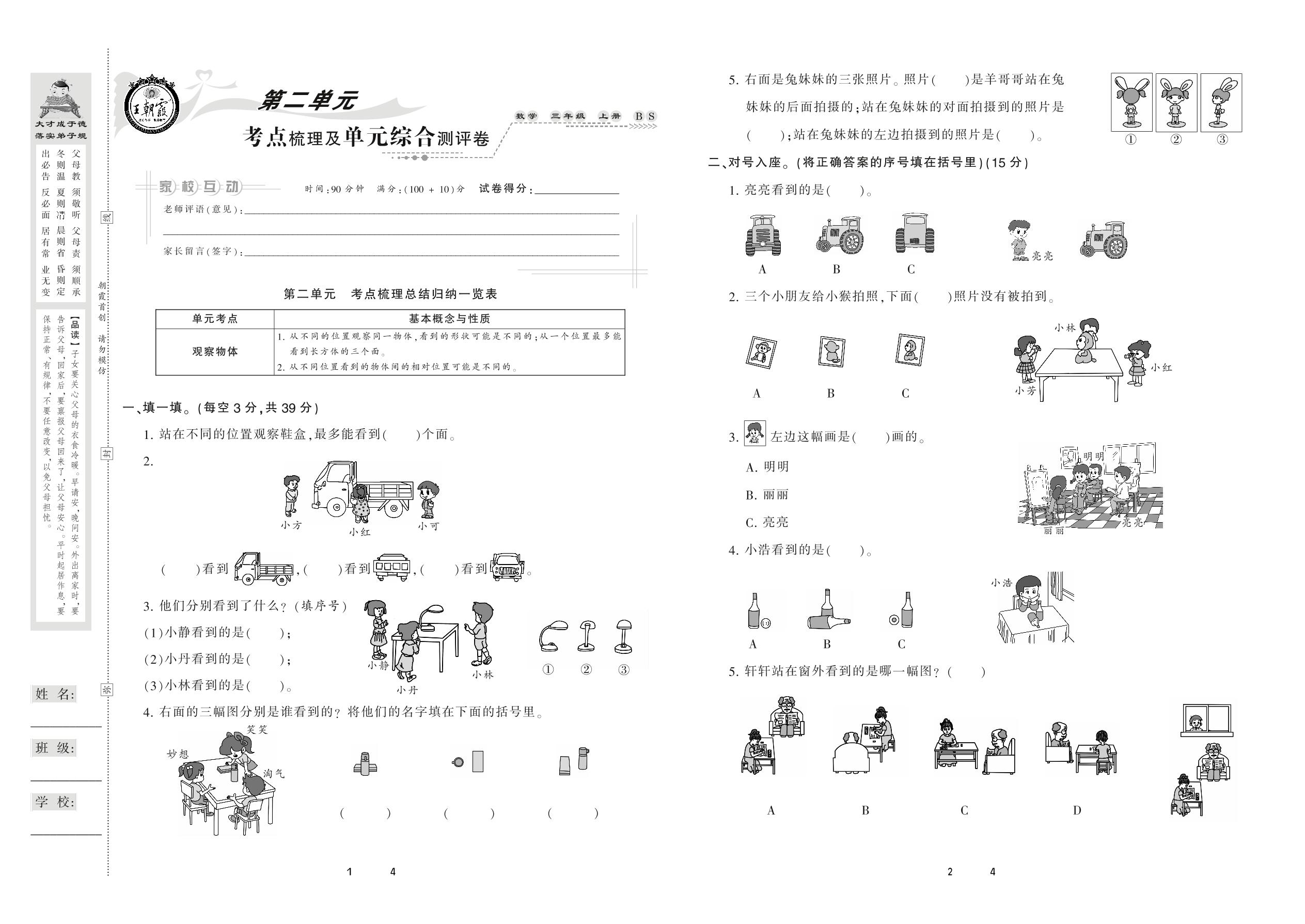 2020上册三年级数学北师版 第二单元 考点梳理及单元综合测评卷