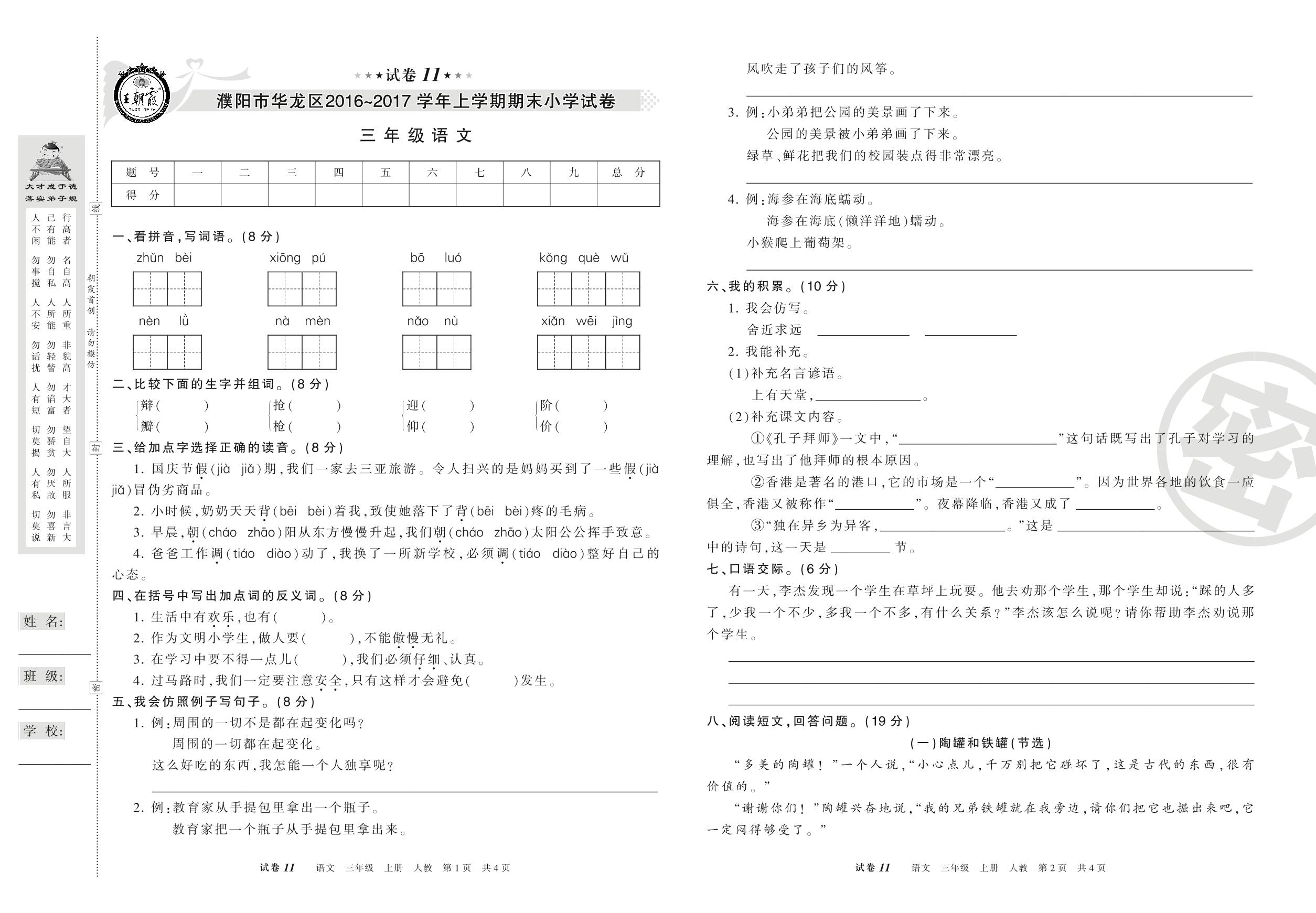 2016-2017学年第一学期濮阳市华龙区三年级语文试卷(人教版)【11】