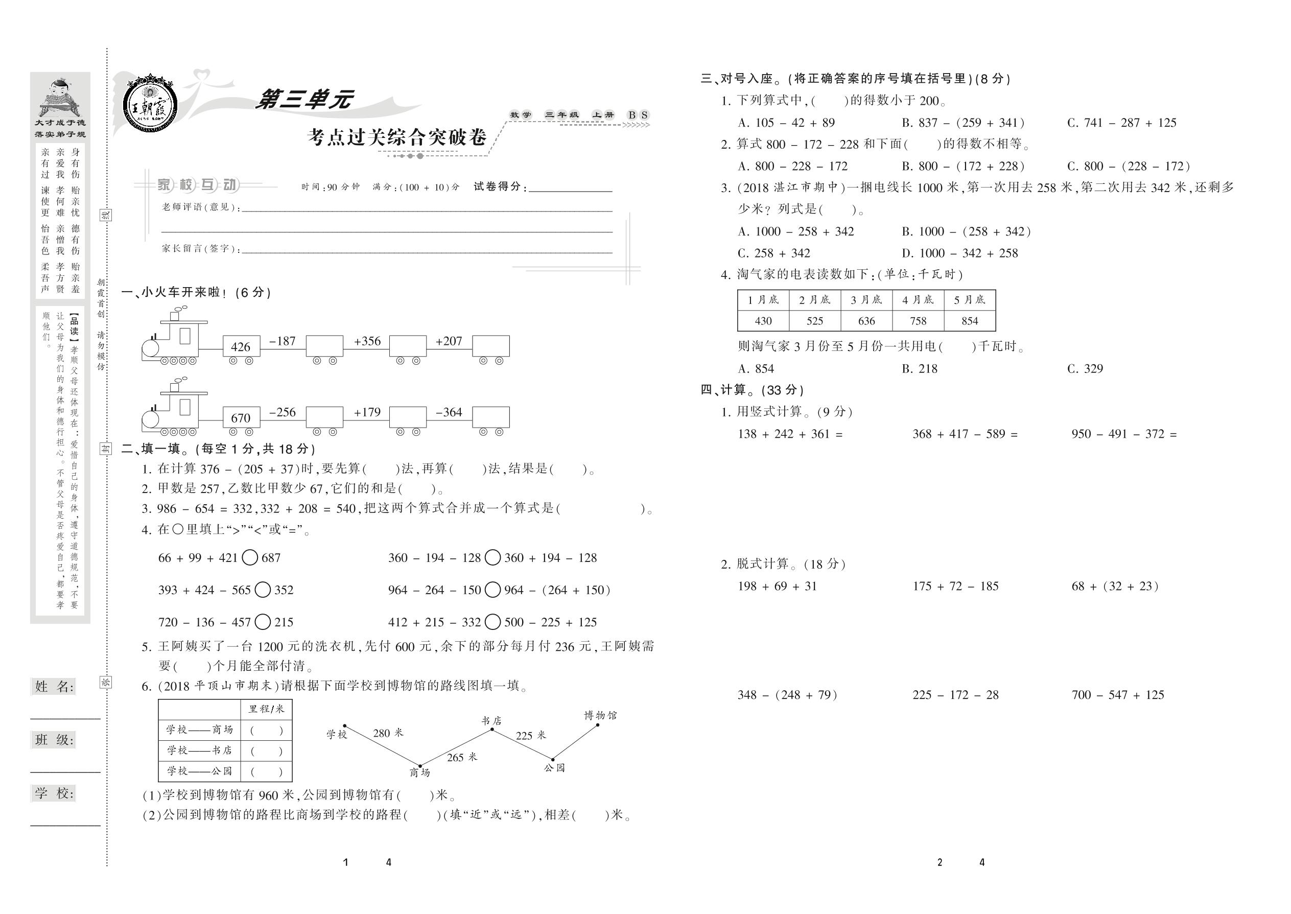 2020上册三年级数学北师版 第三单元 考点过关综合突破卷