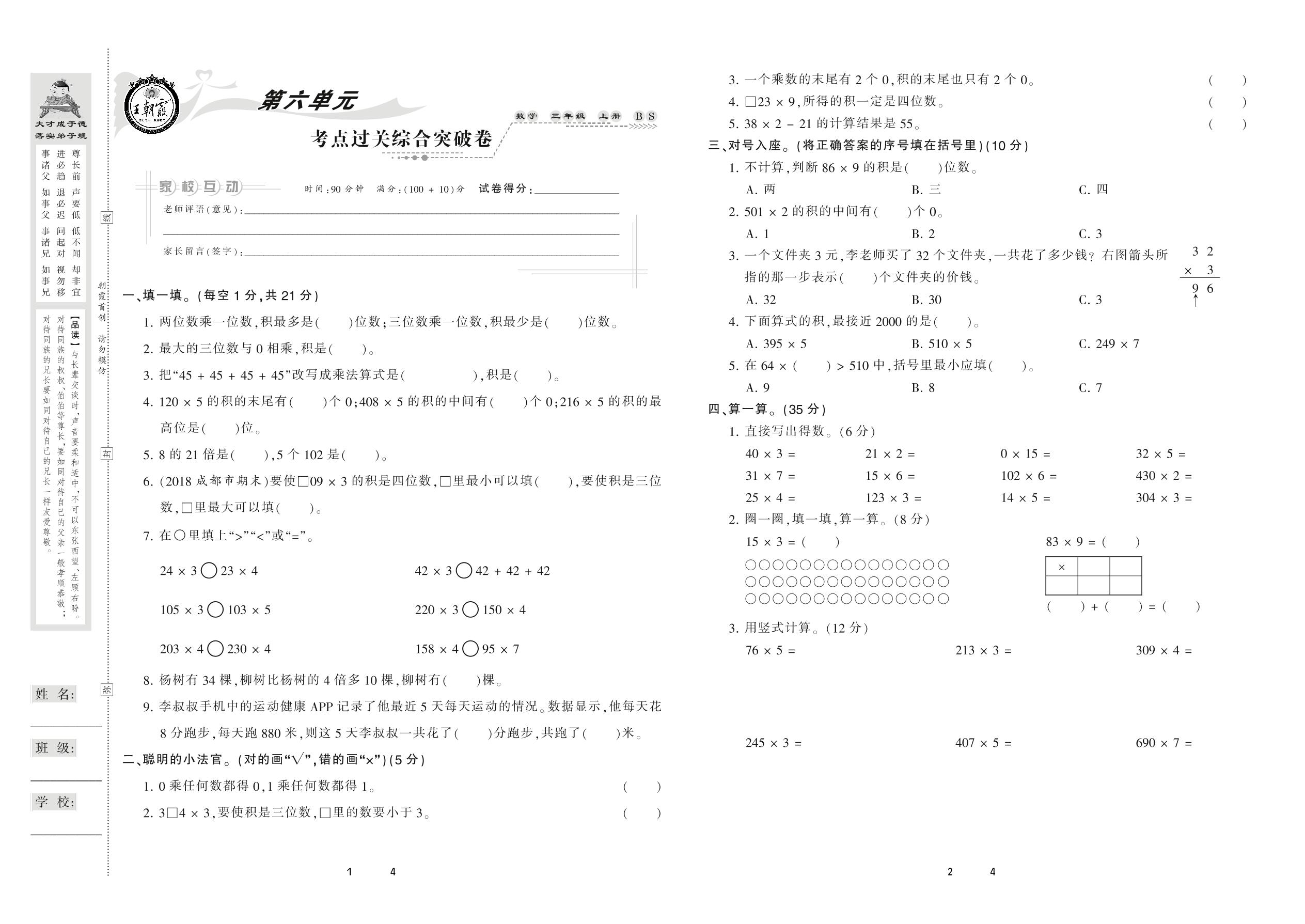 2020上册三年级数学北师版 第六单元 考点过关综合突破卷