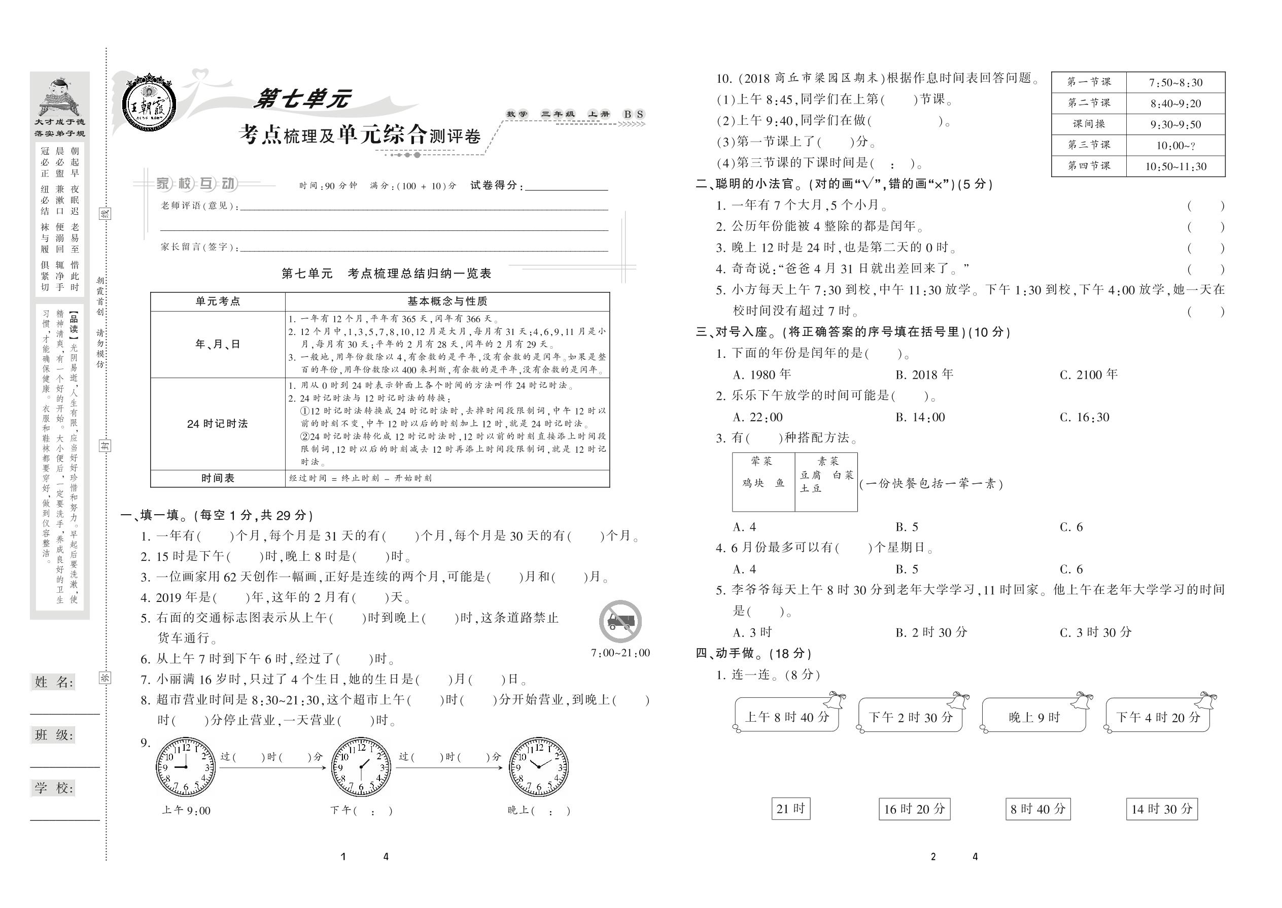 2020上册三年级数学北师版 第七单元 考点梳理及单元综合测评卷