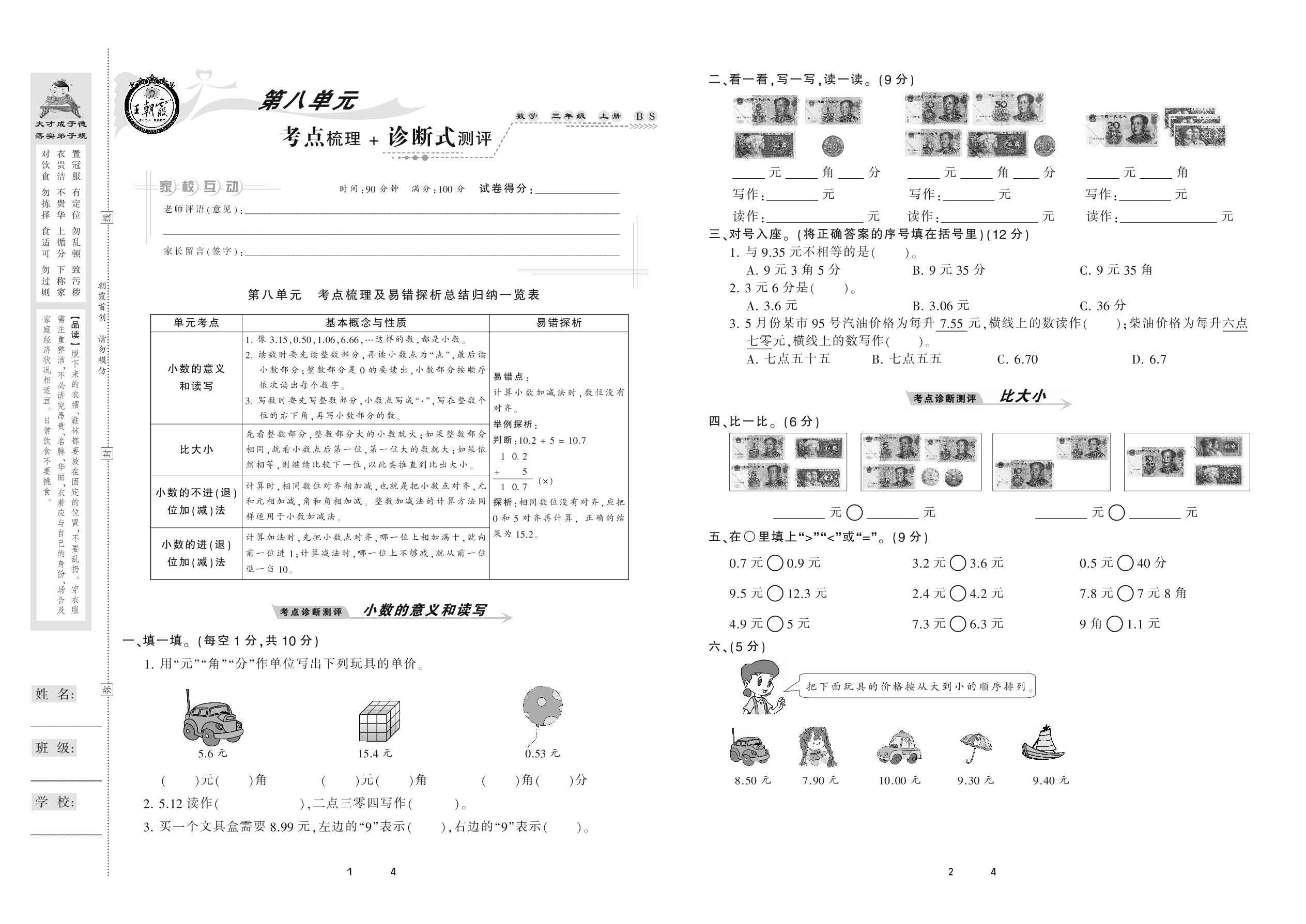 2020上册三年级数学北师版 第八单元 考点梳理+诊断式测评