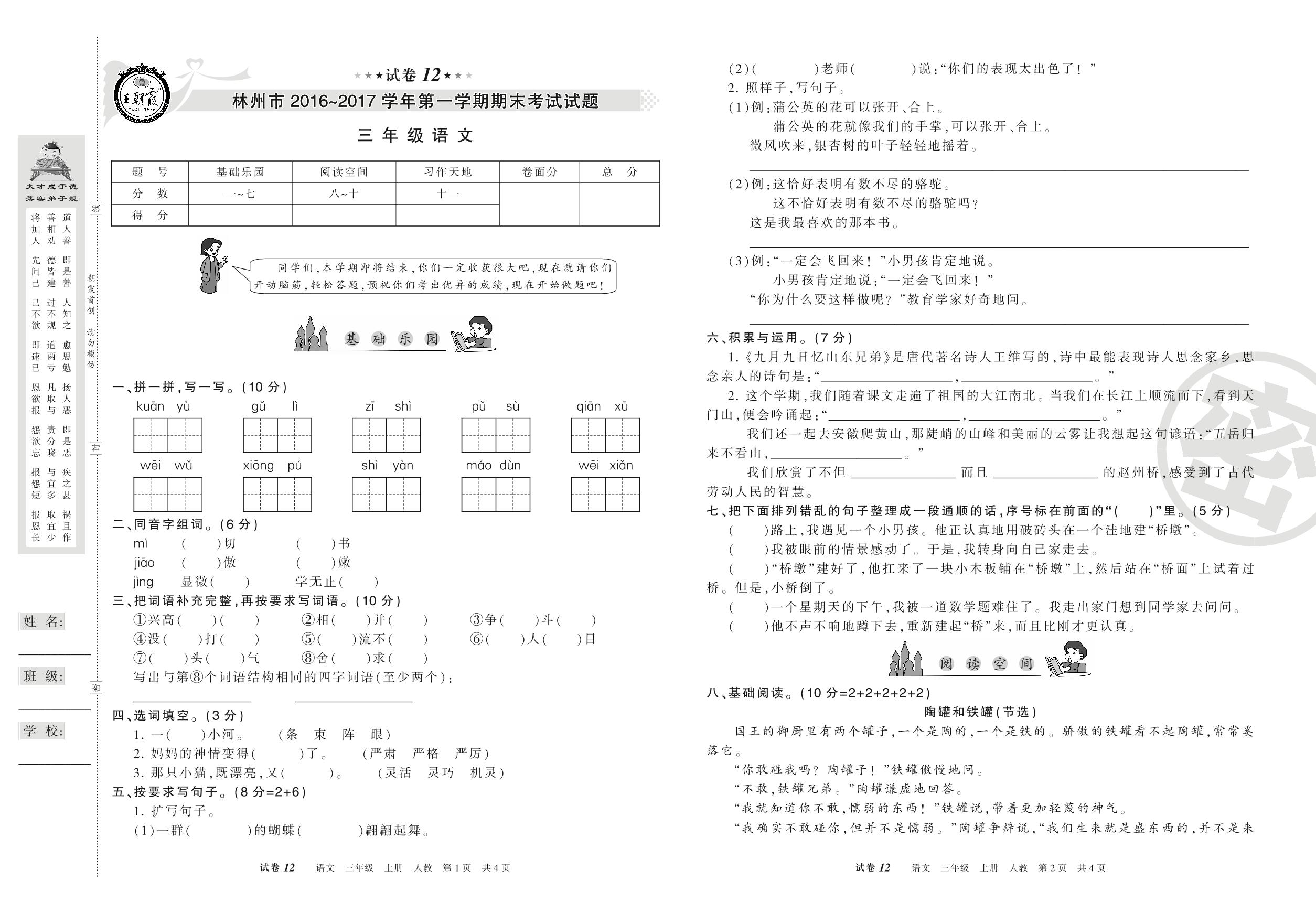 2016-2017学年第一学期林州市三年级语文试卷(人教版)【12】