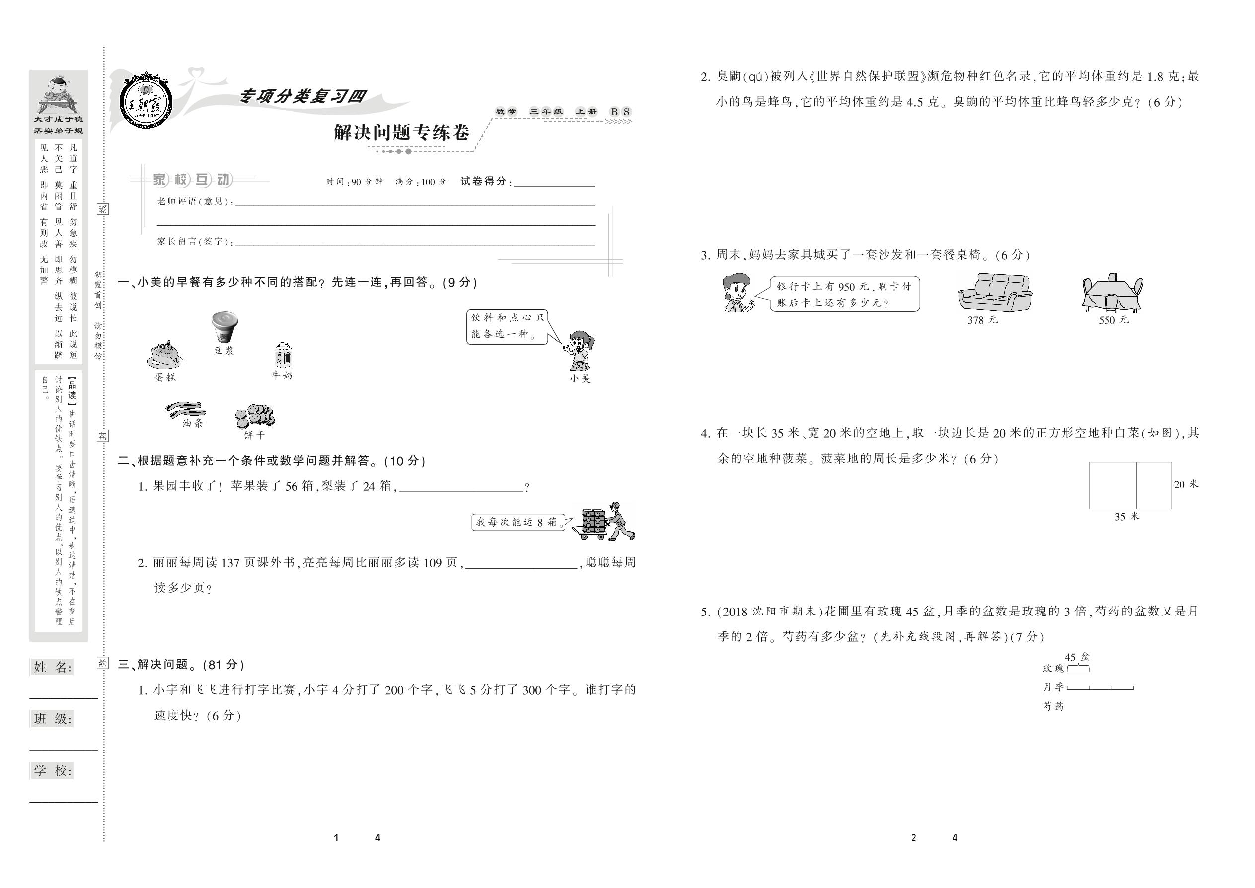 2020上册三年级数学北师版 解决问题专练卷