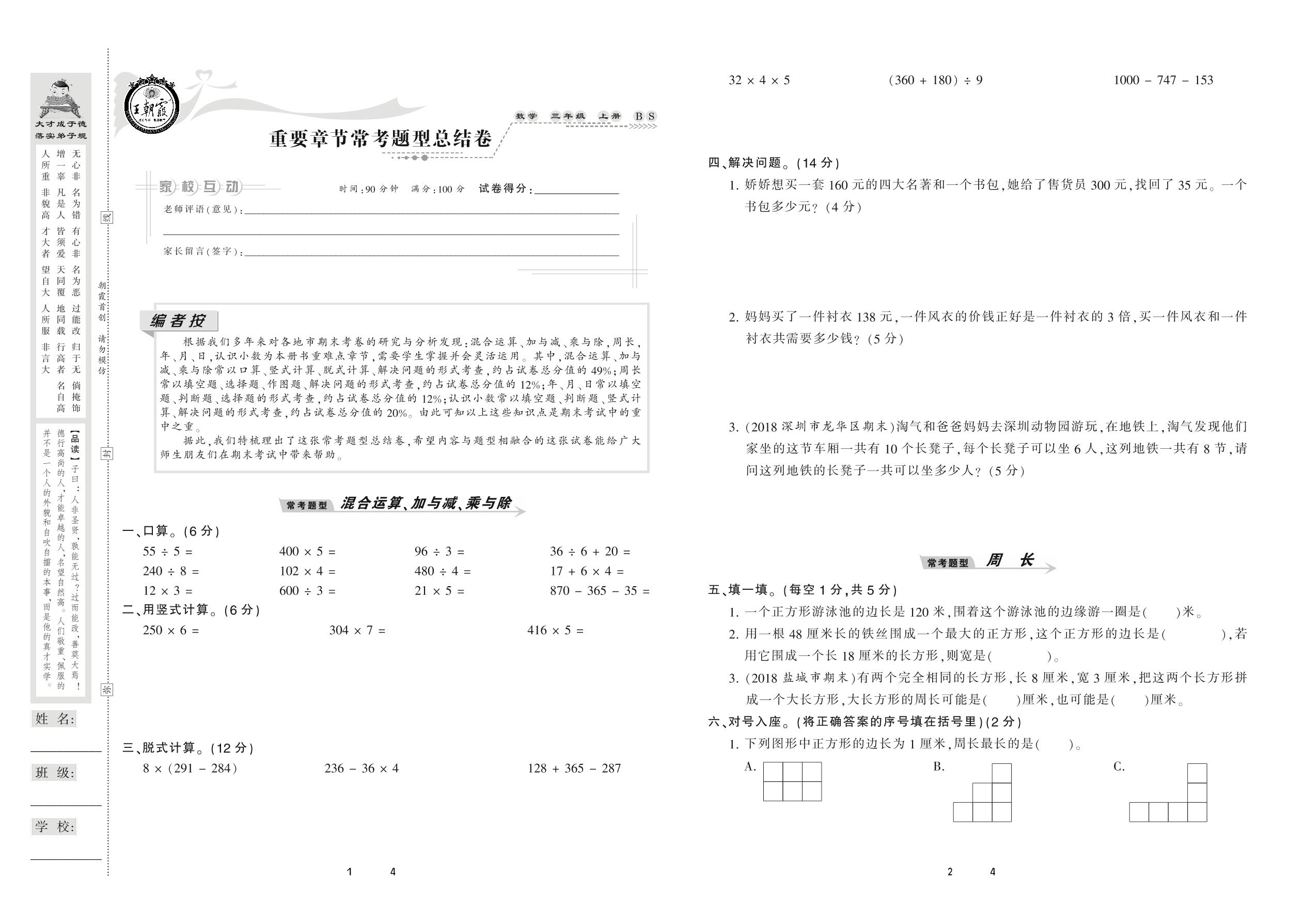 2020上册三年级数学北师版 重要章节常考题型总结卷