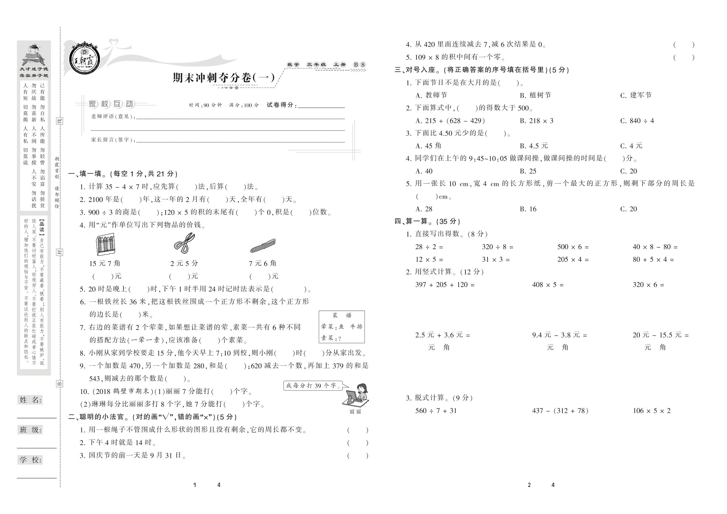 2020上册三年级数学北师版 期末冲刺夺分卷(一)