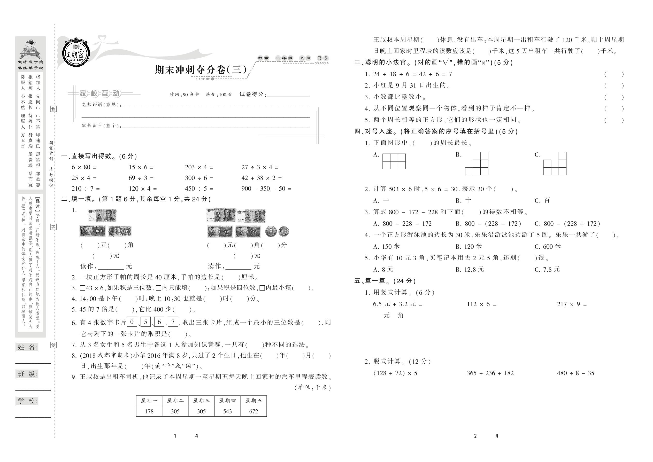 2020上册三年级数学北师版 期末冲刺夺分卷(三)