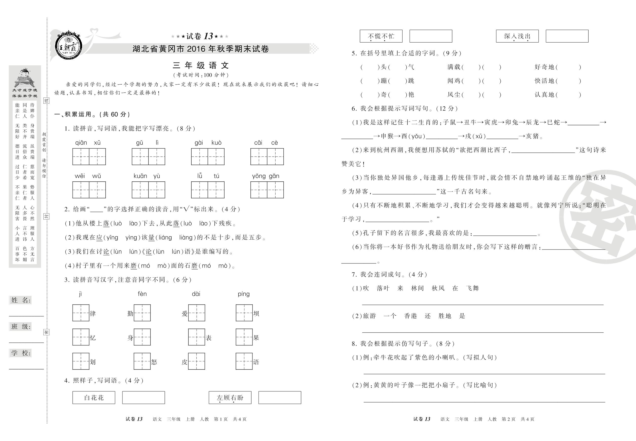 2016-2017学年第一学期湖北省黄冈市三年级语文试卷(人教版)【13】