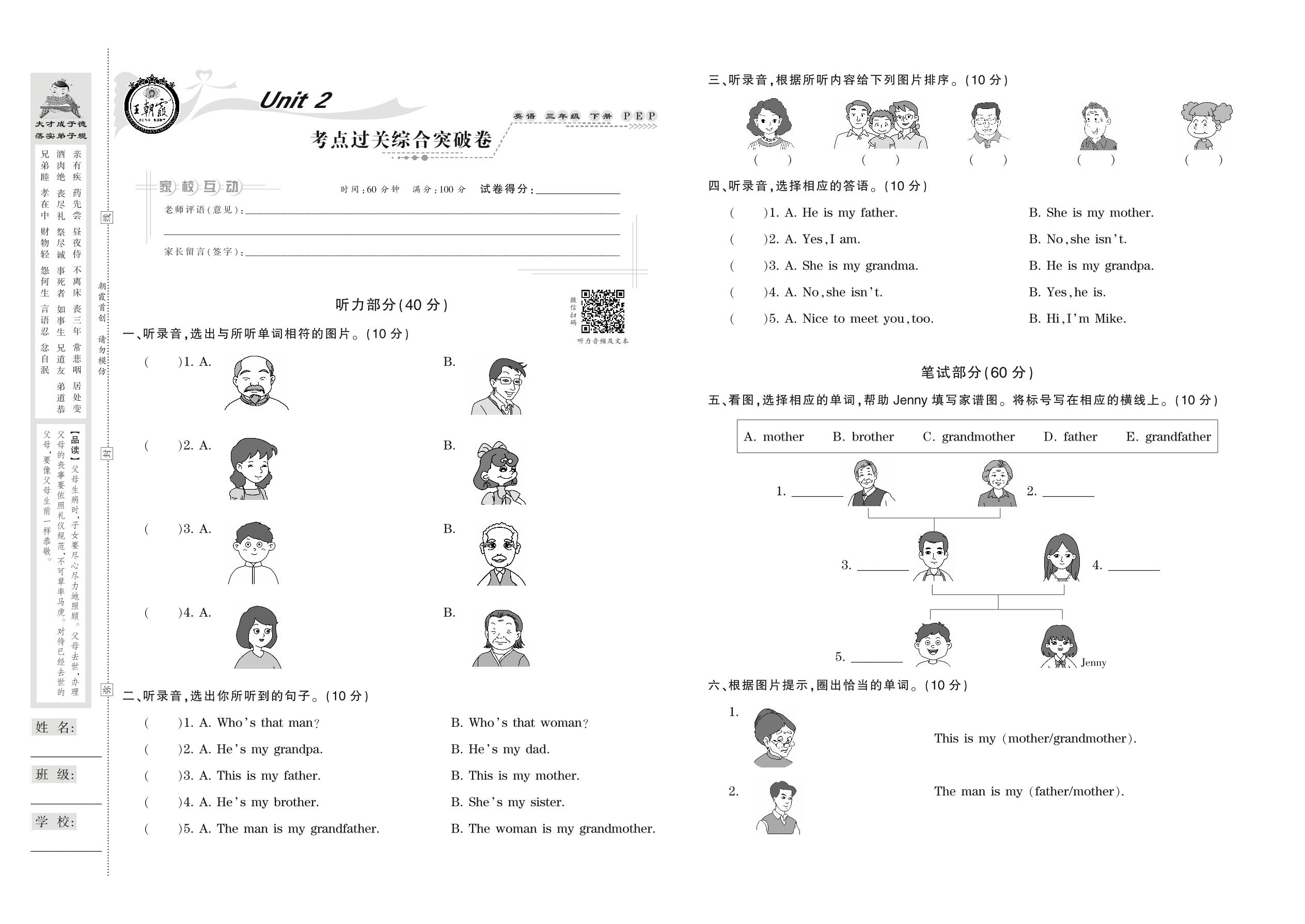 2021下册三年级英语PEP版 Unit 2 考点过关综合突破卷