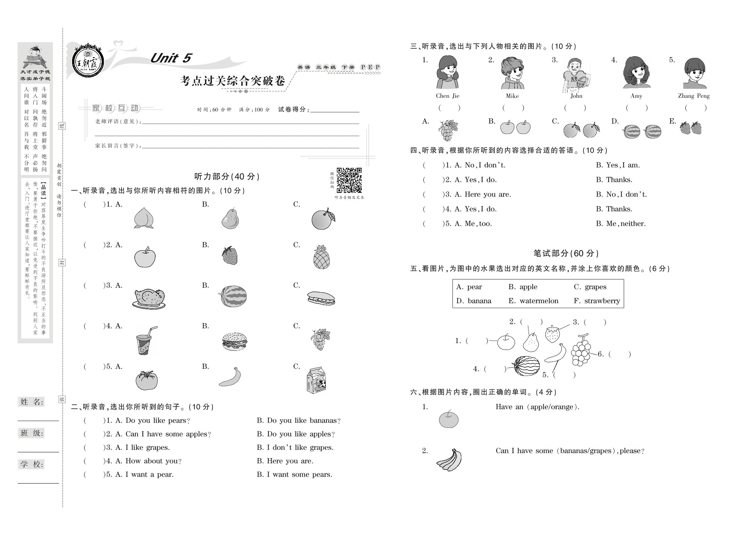 三年级英语人教PEP版(三起始)下册单元卷