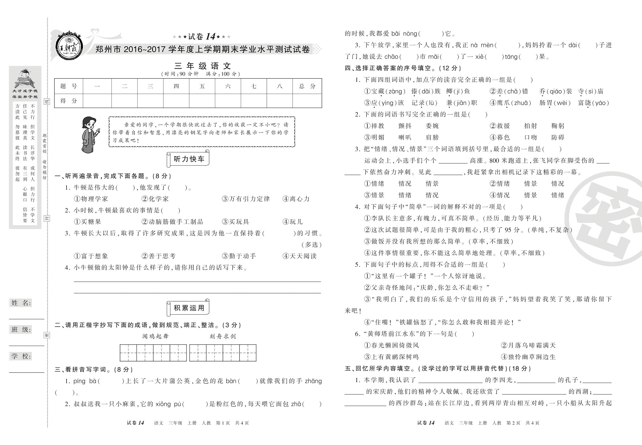 2016-2017学年第一学期郑州市三年级语文试卷(人教版)【14】