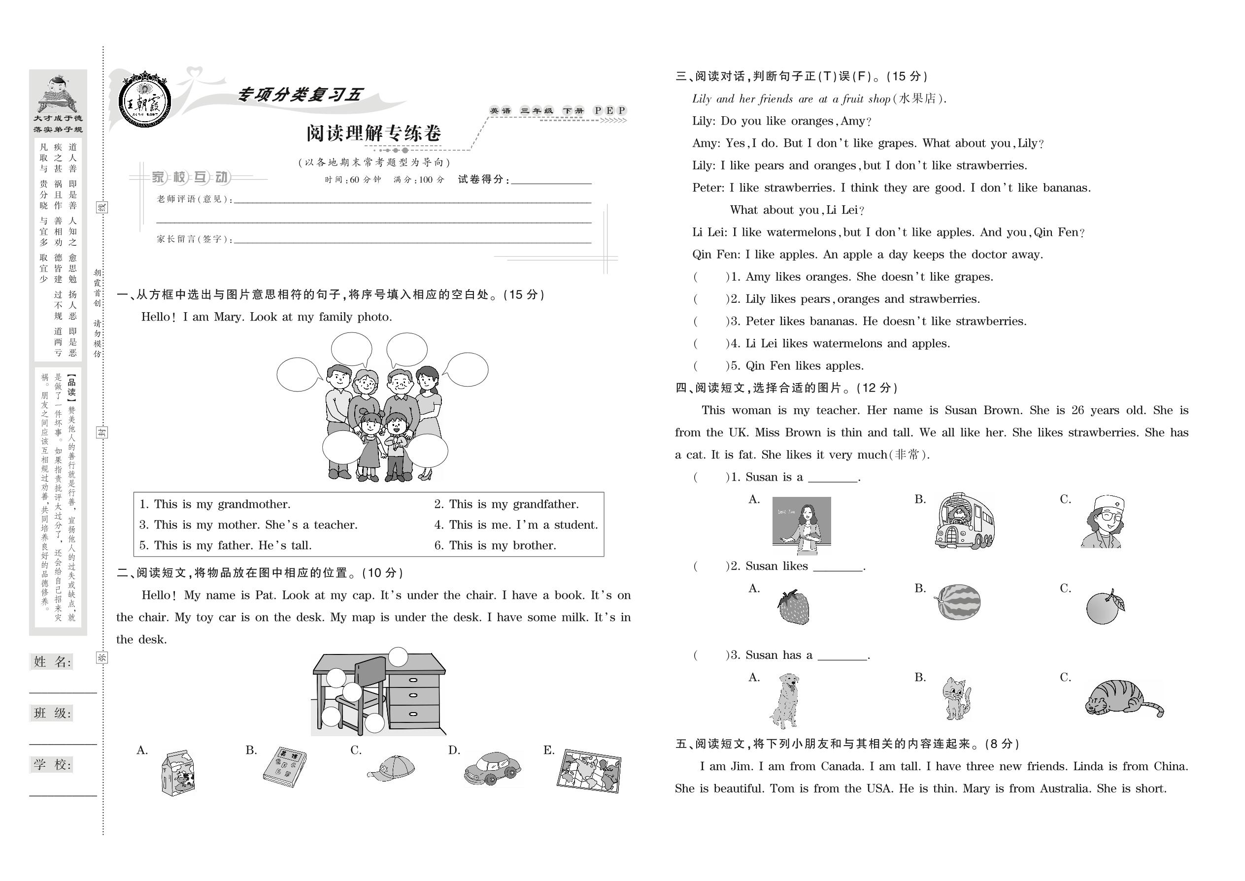 2021下册三年级英语PEP版 阅读理解专练卷
