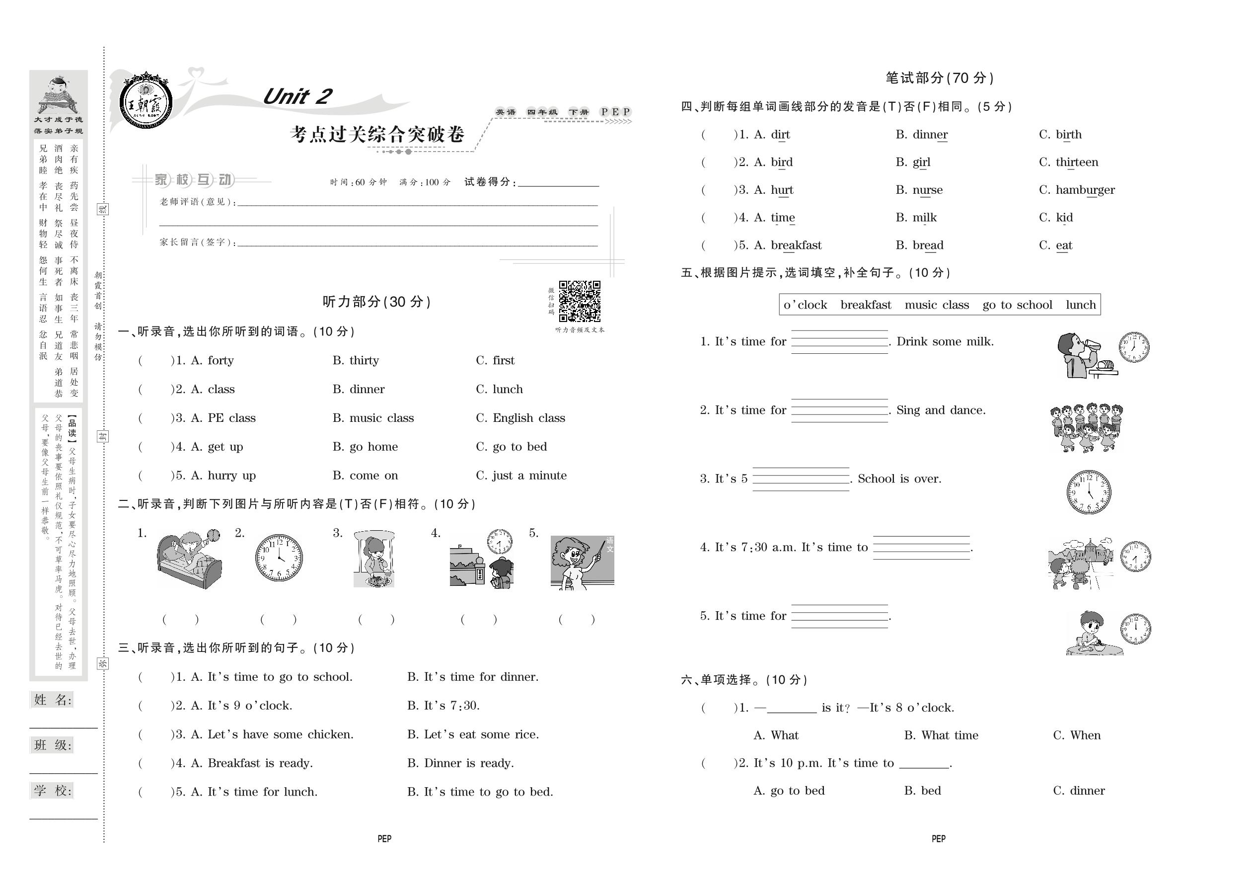 2021下册四年级英语PEP版 Unit 2 考点过关综合突破卷
