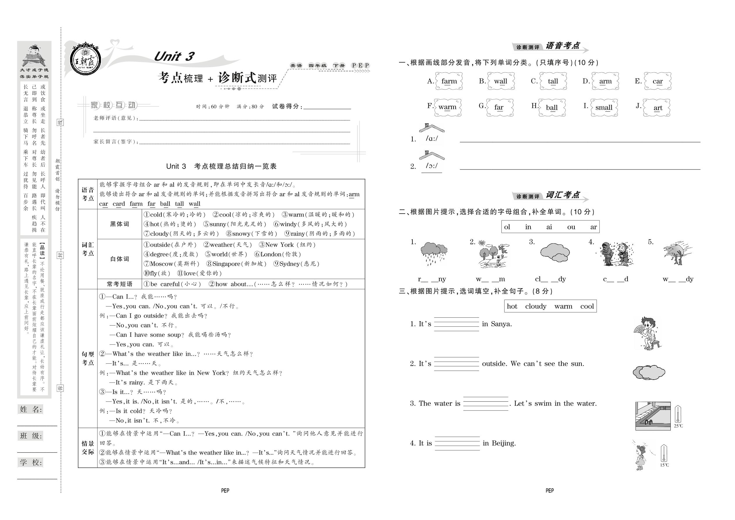 2021下册四年级英语PEP版 Unit 3 考点梳理+诊断式测评