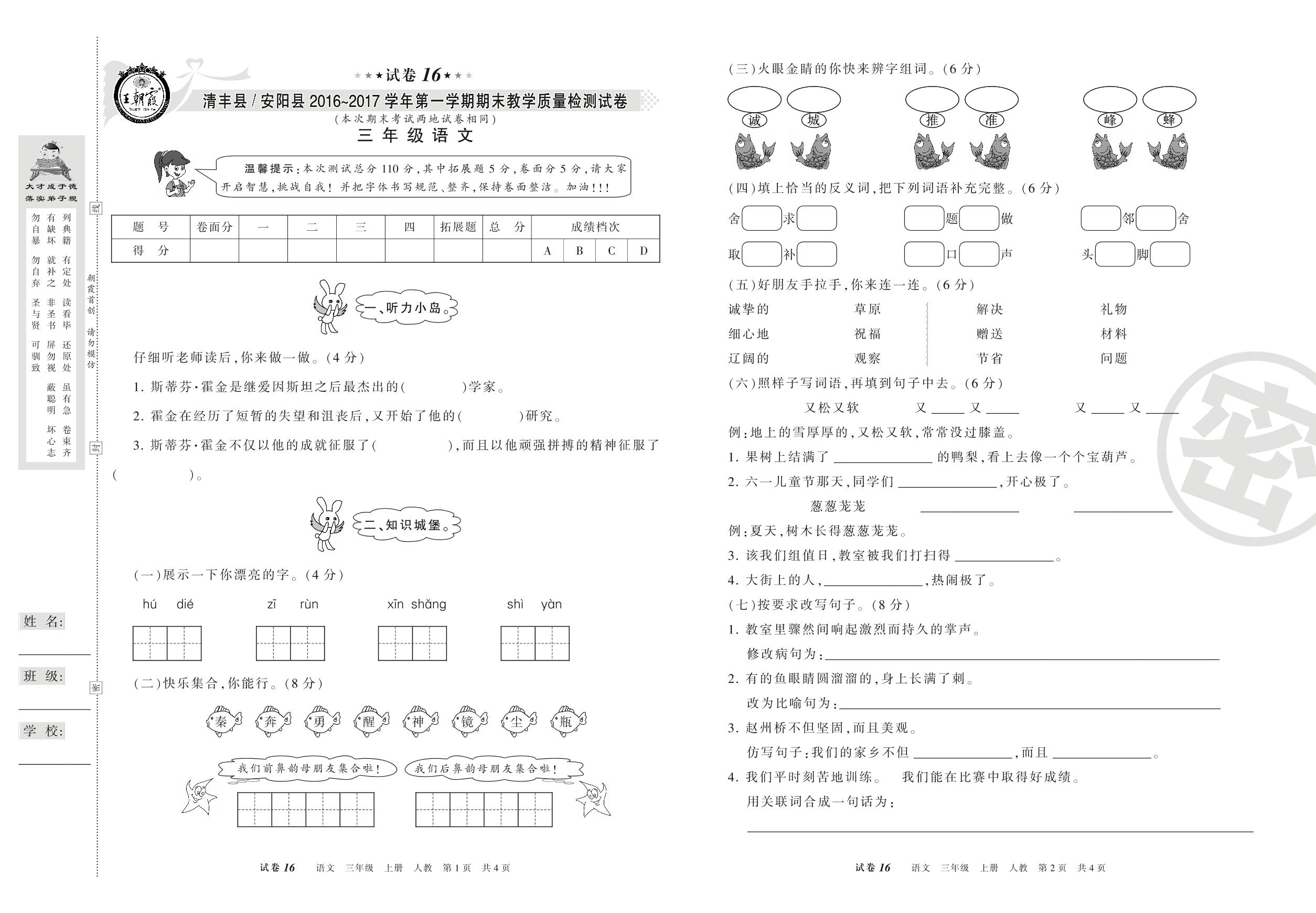 2016-2017学年第一学期清丰县安阳县三年级语文试卷(人教版)【16】