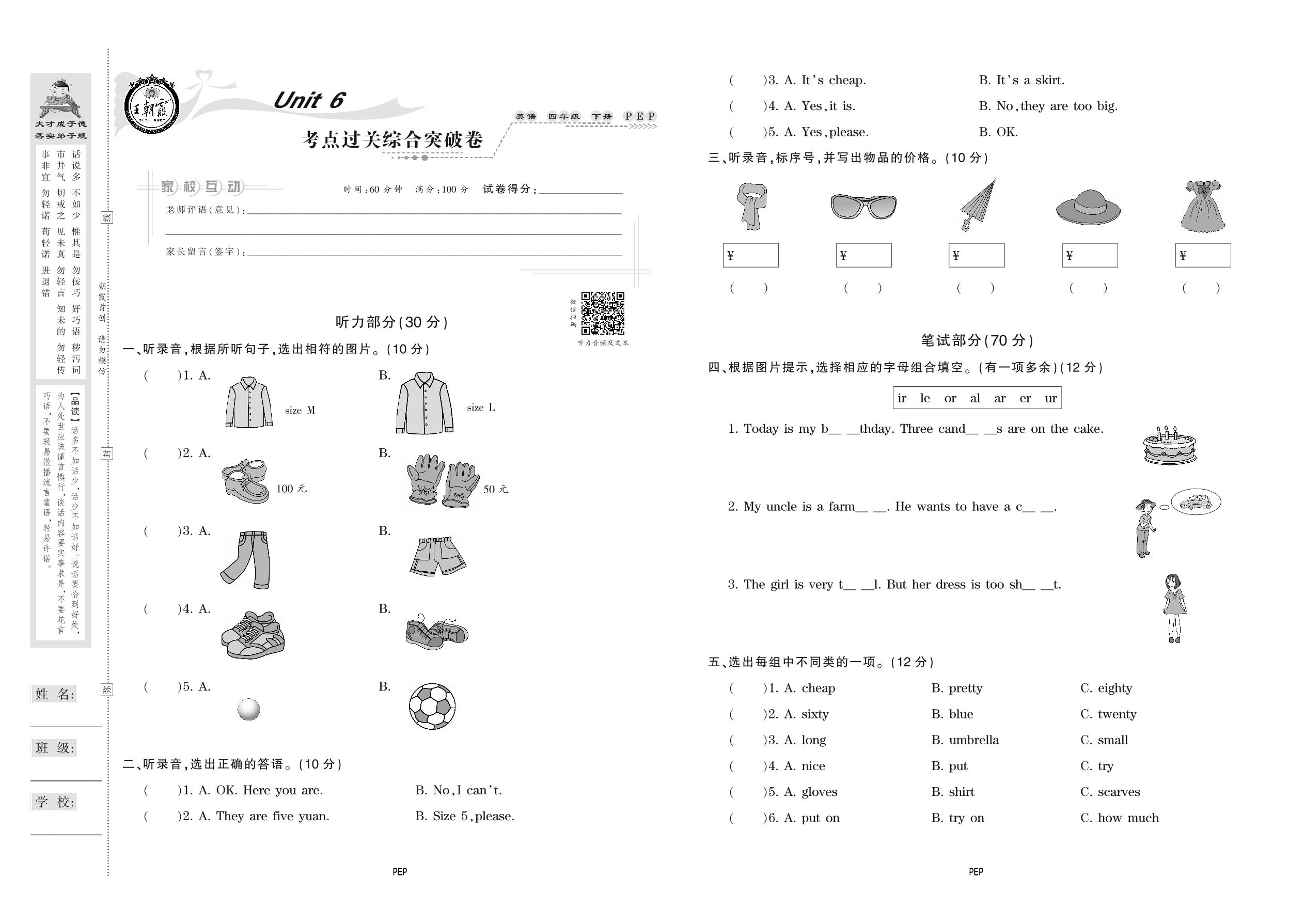 2021下册四年级英语PEP版 Unit 6 考点过关综合突破卷