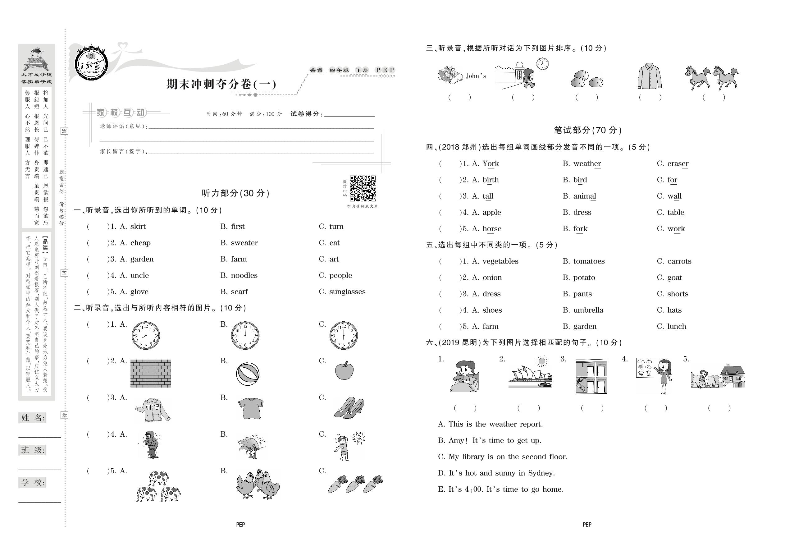 2021下册四年级英语PEP版 期末冲刺夺分卷(一)