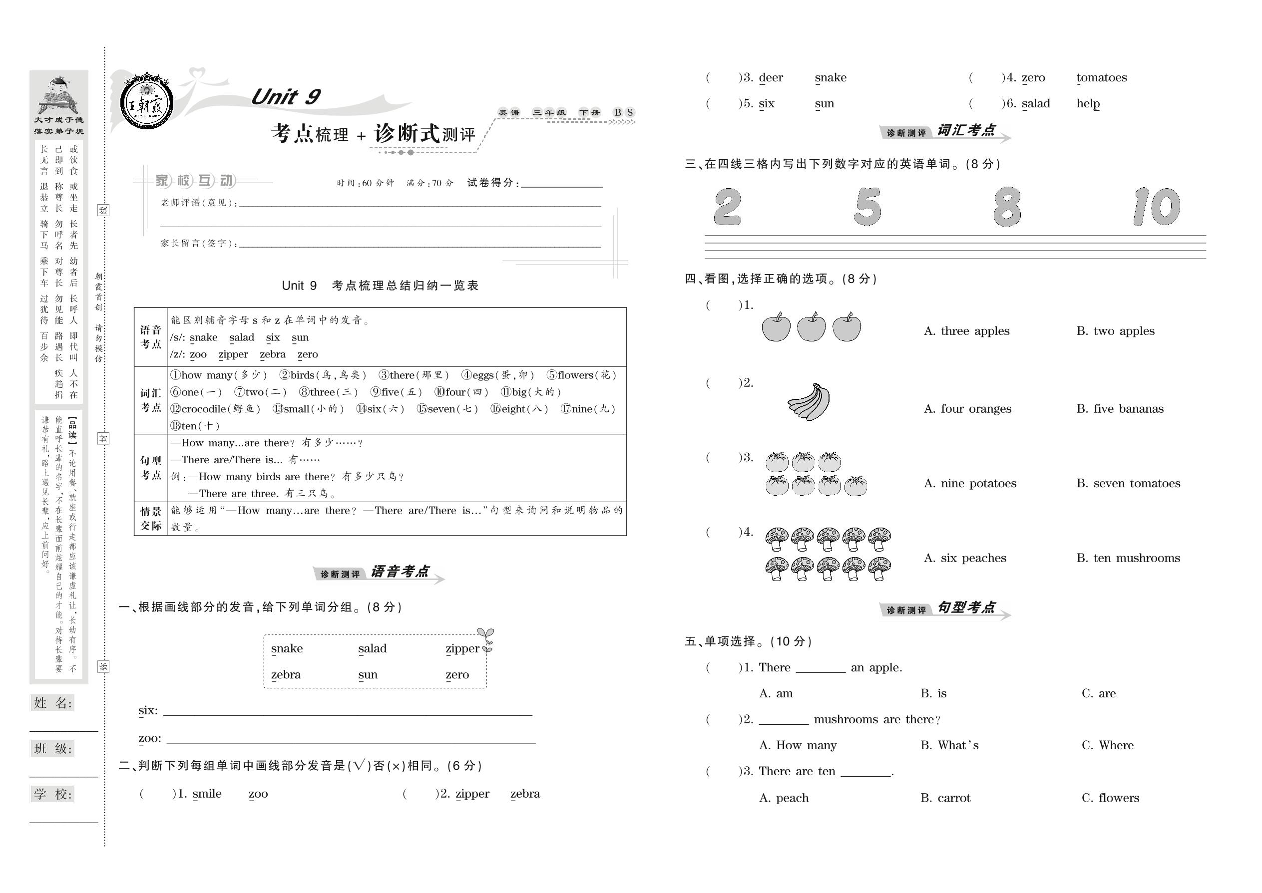 2021下册三年级英语北师版 Unit 9 考点梳理+诊断式测评