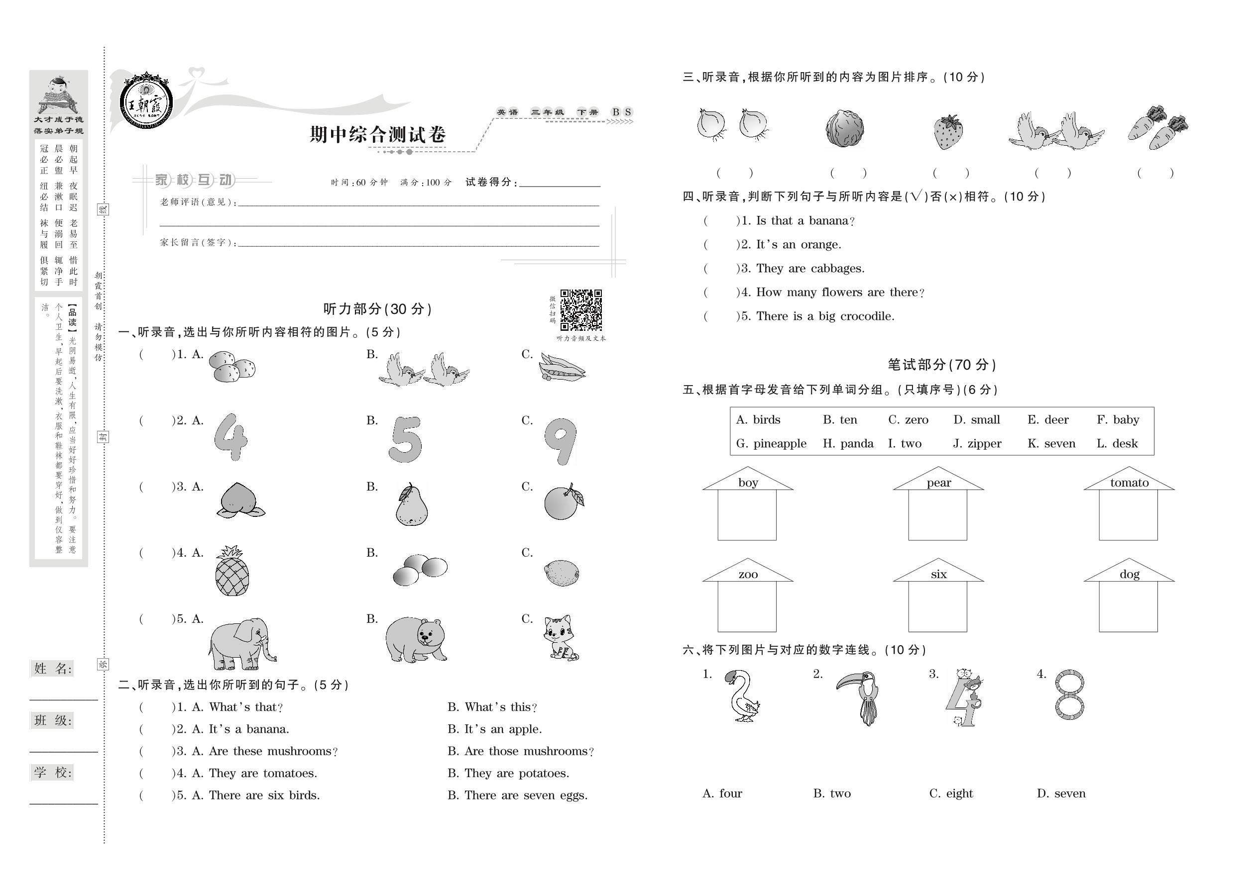 三年级英语北师版下册期中卷