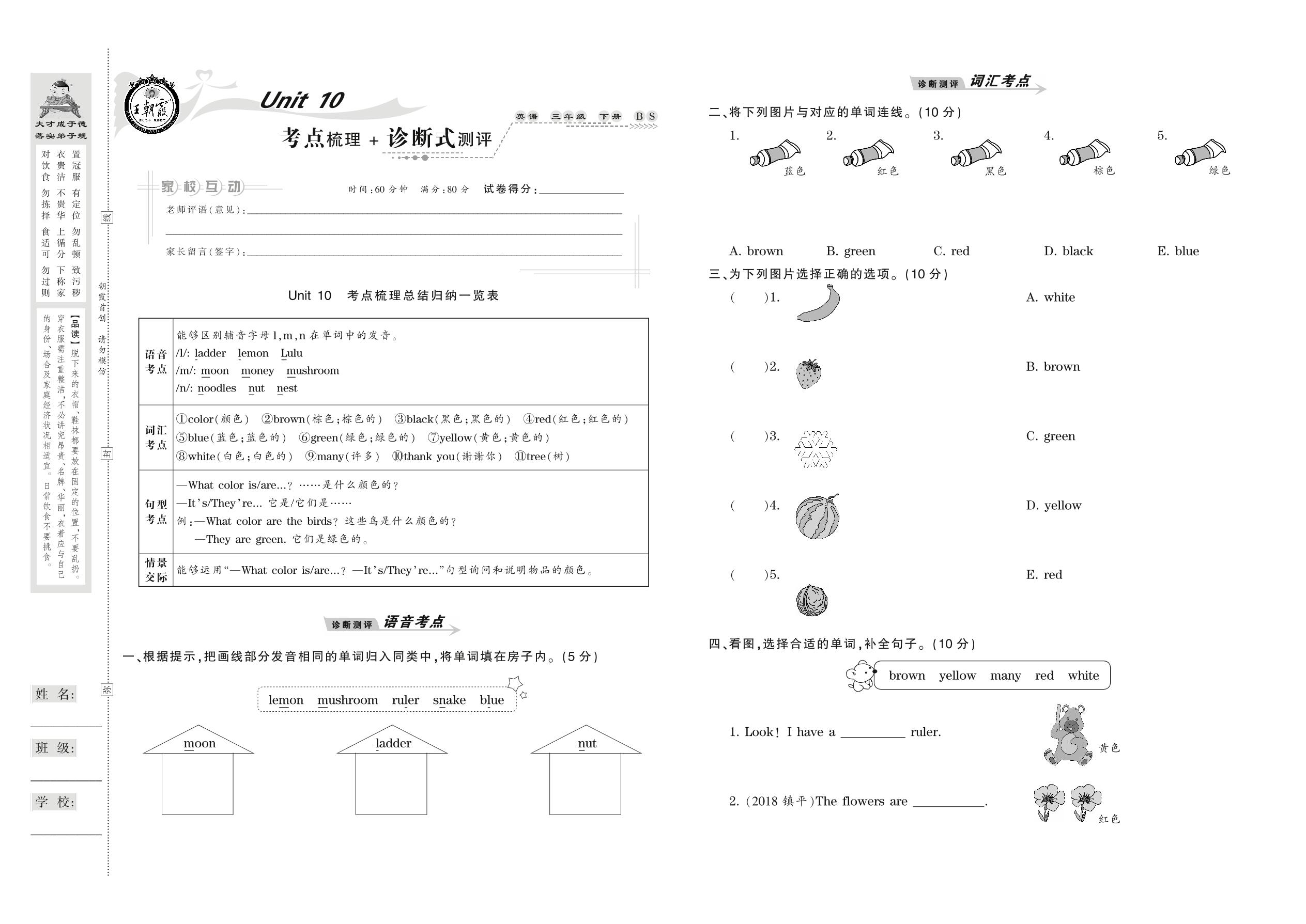 2021下册三年级英语北师版 Unit 10 考点梳理+诊断式测评