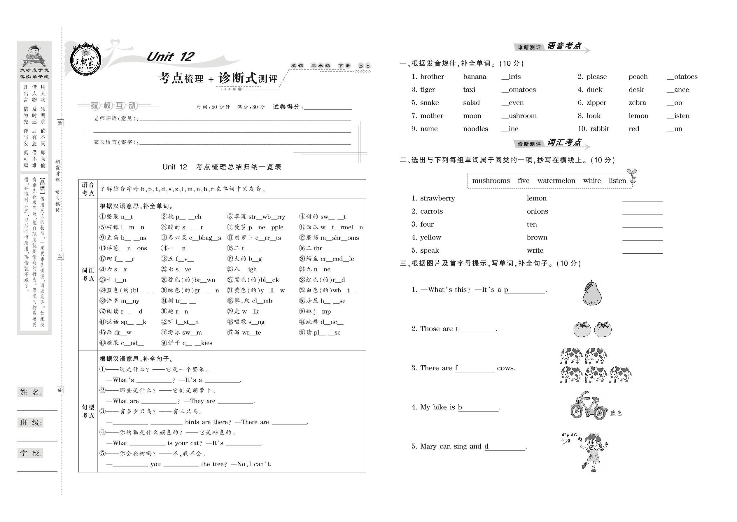 2021下册三年级英语北师版 Unit 12 考点梳理+诊断式测评