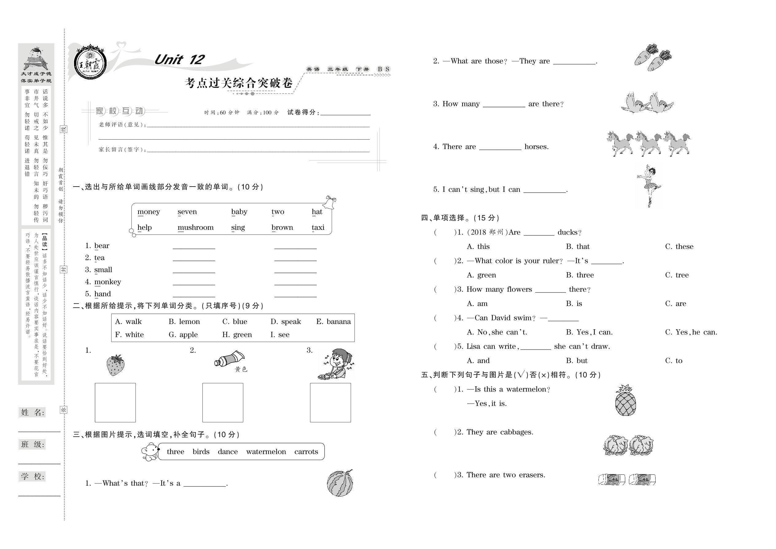 2021下册三年级英语北师版 Unit 12 考点过关综合突破卷