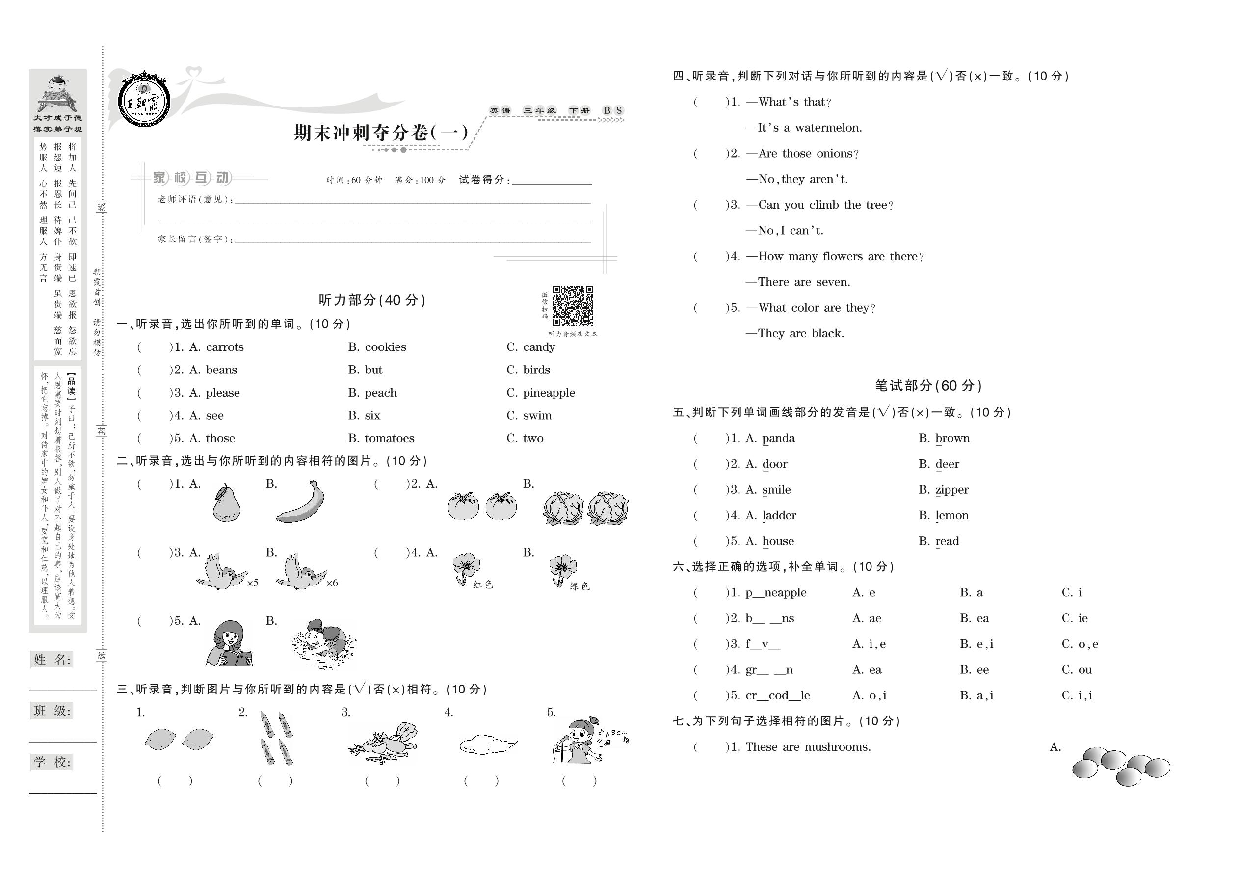 2021下册三年级英语北师版 期末冲刺夺分卷(一)