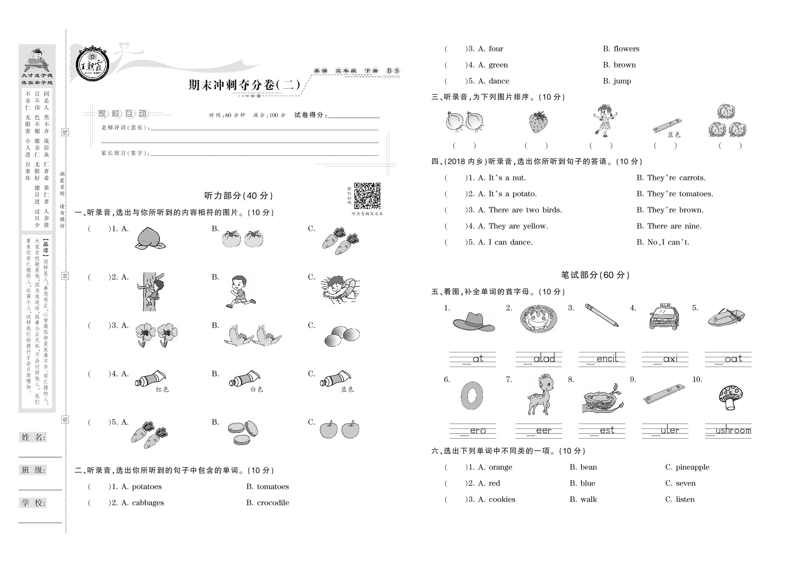 2021下册三年级英语北师版 期末冲刺夺分卷(二)