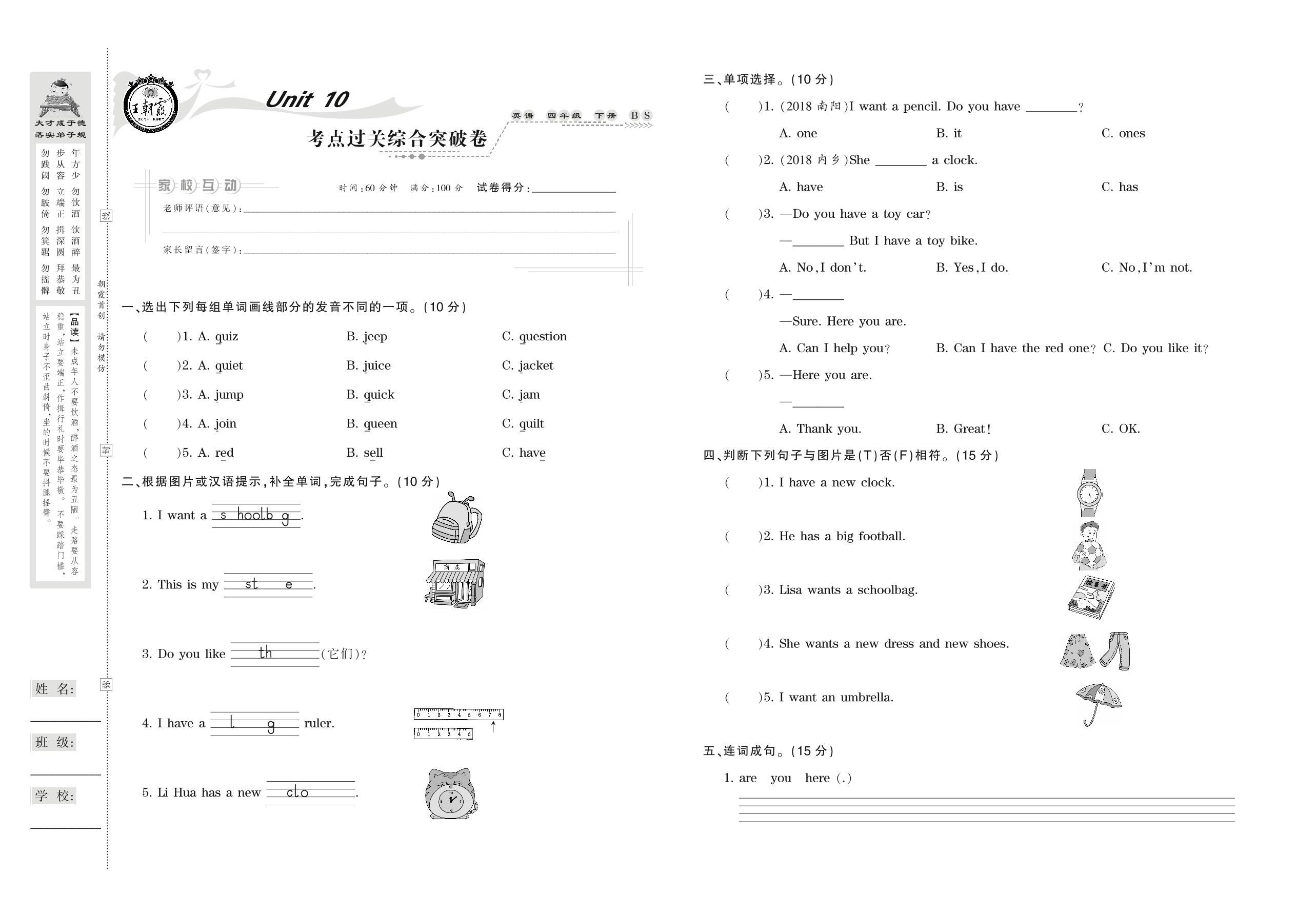 2021下册四年级英语北师版 Unit 10 考点过关综合突破卷