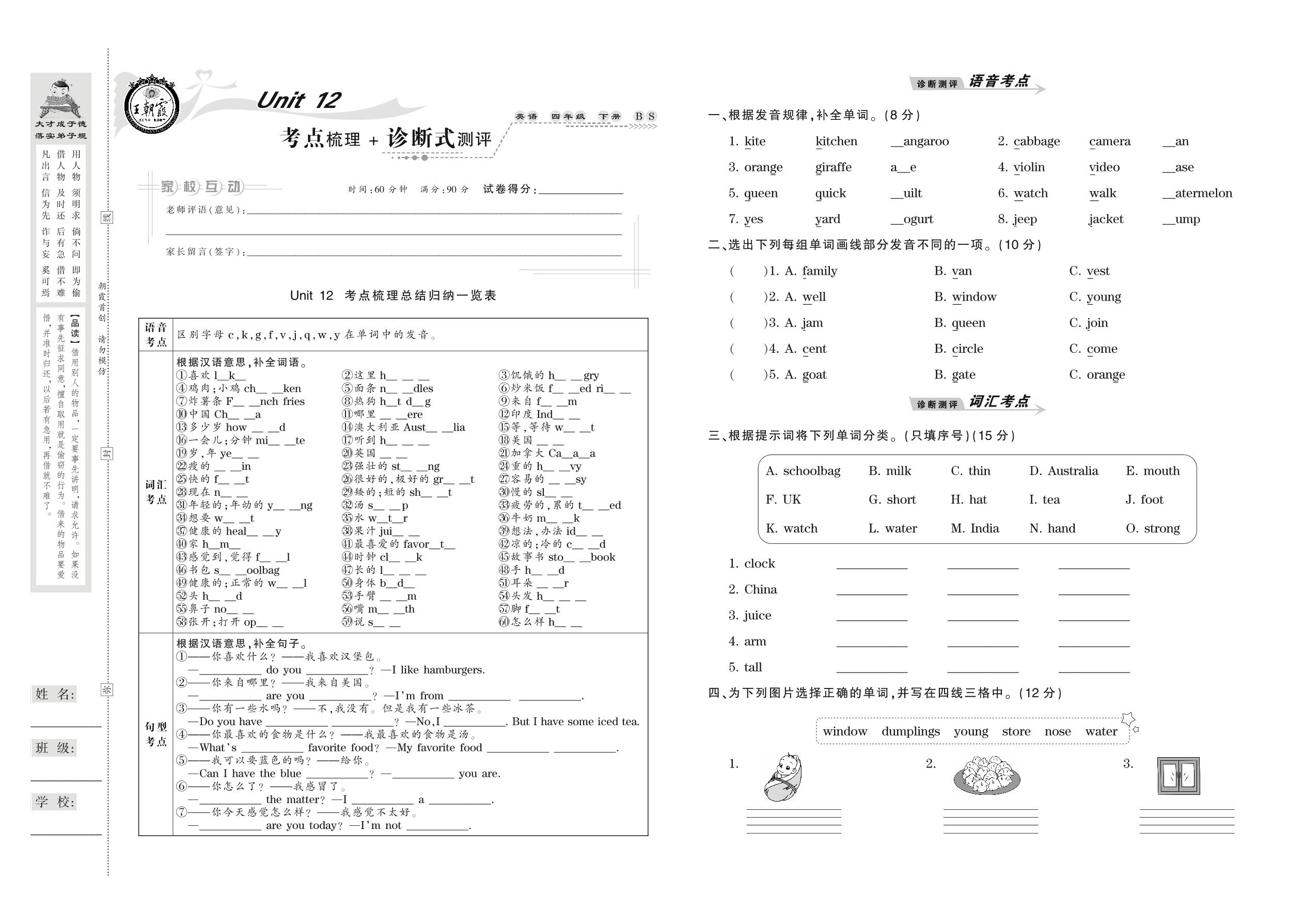 2021下册四年级英语北师版 Unit 12 考点梳理+诊断式测评
