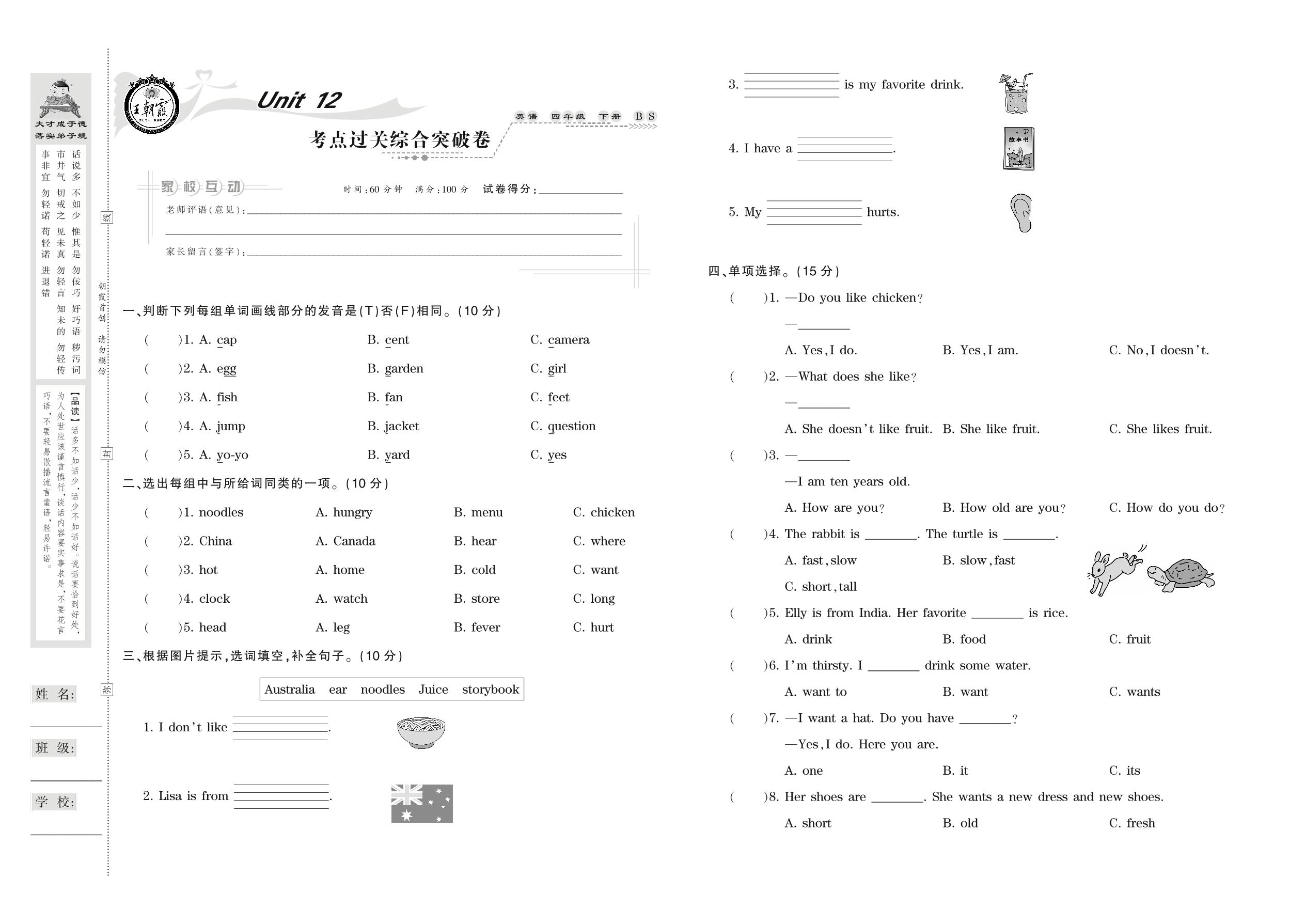 2021下册四年级英语北师版 Unit 12 考点过关综合突破卷
