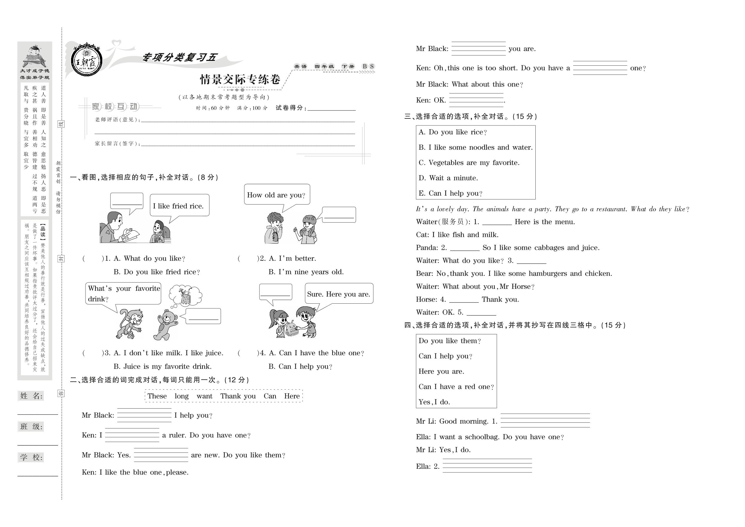 2021下册四年级英语北师版 情景交际专练卷