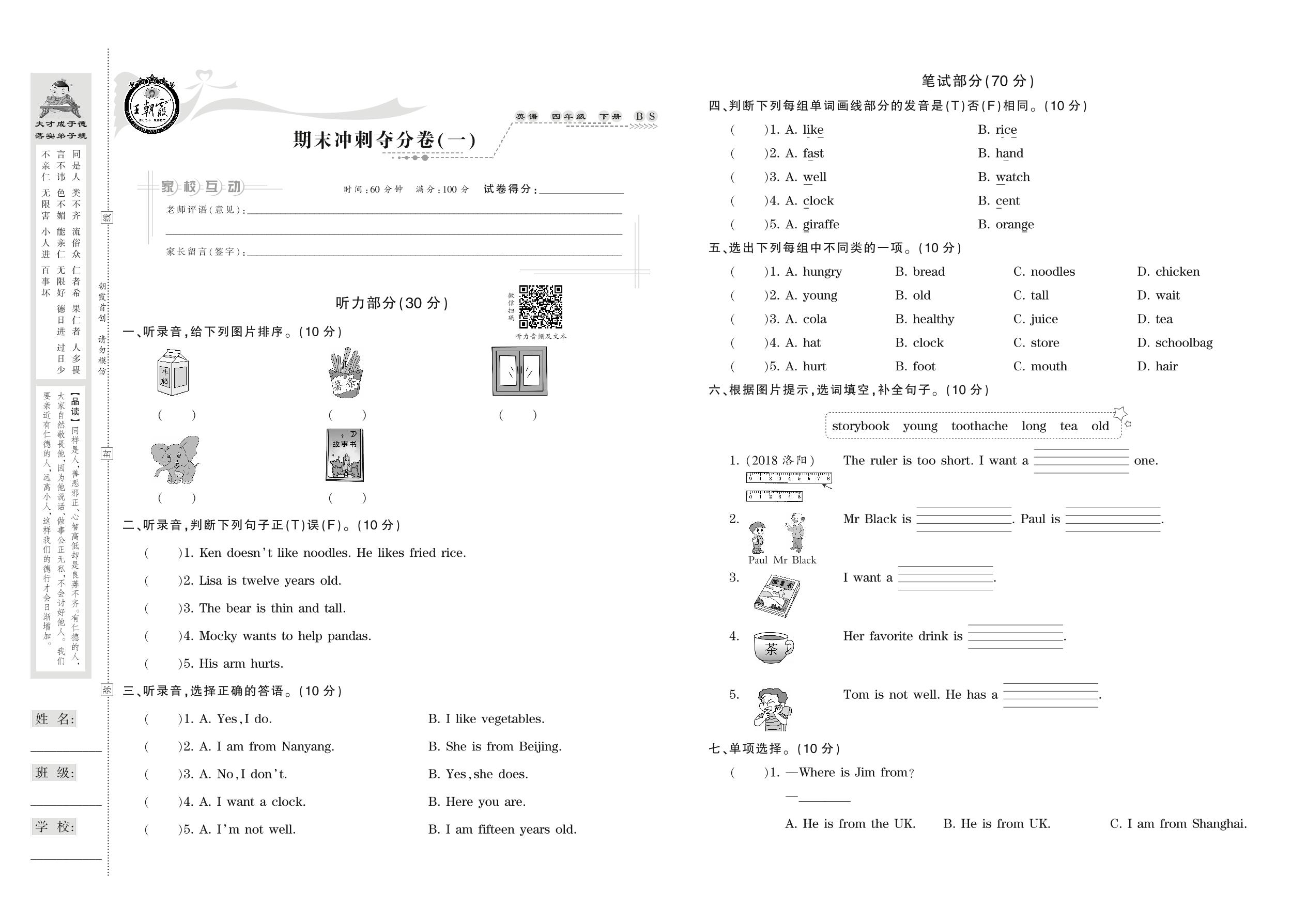 2021下册四年级英语北师版 期末冲刺夺分卷(一)