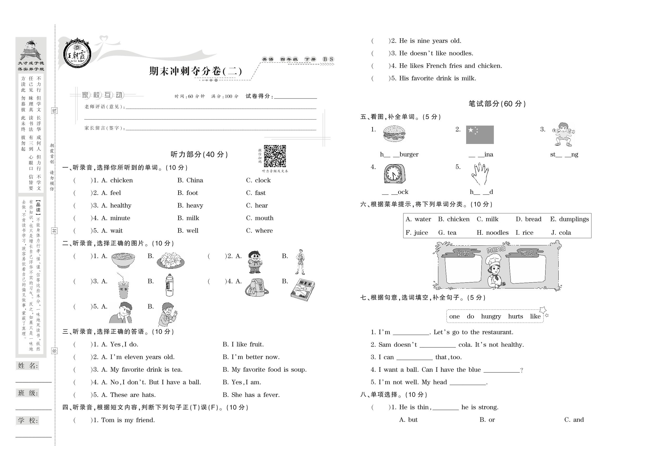 2021下册四年级英语北师版 期末冲刺夺分卷(二)