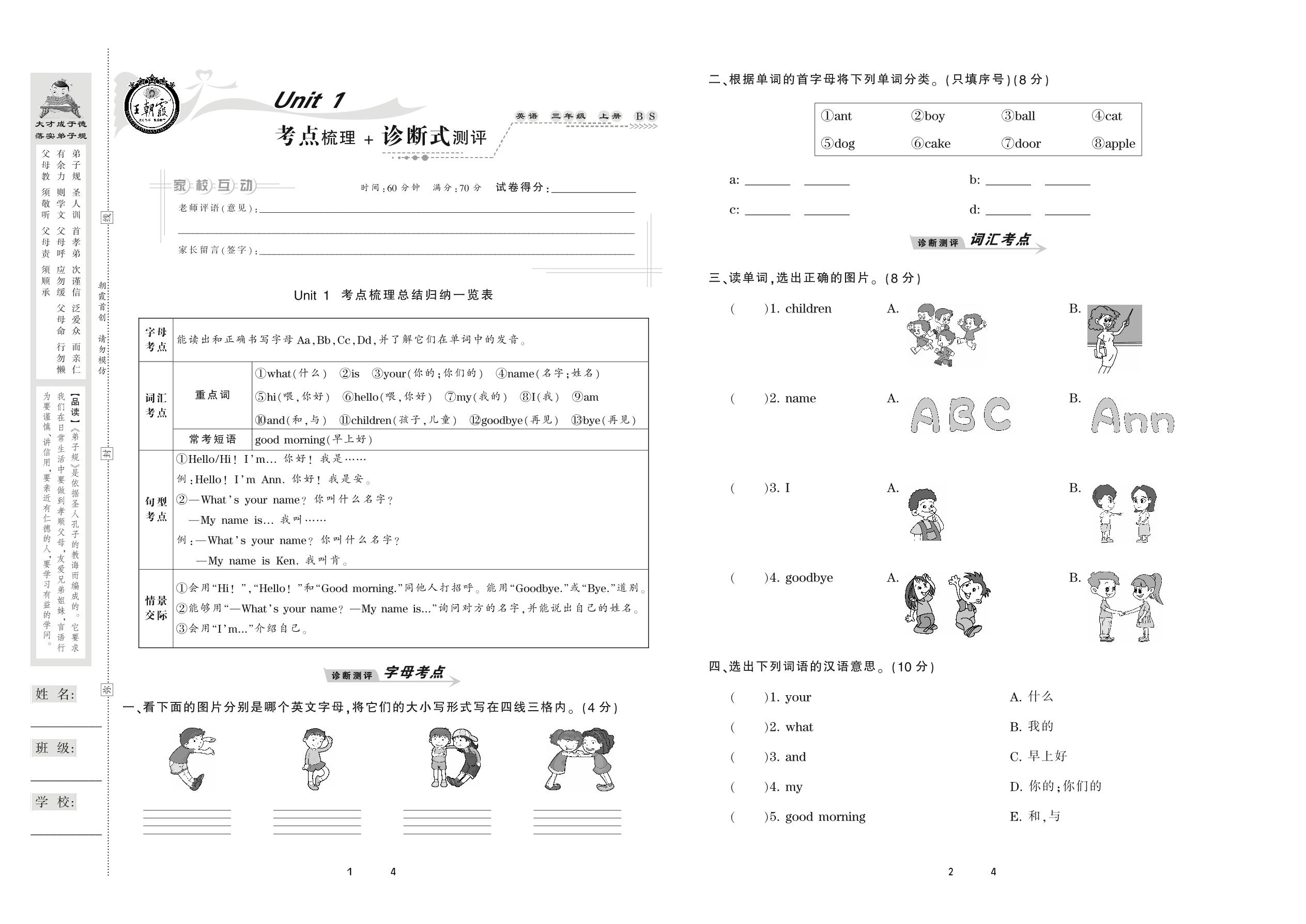 2020上册三年级英语北师版 Unit 1 考点梳理+诊断式测评