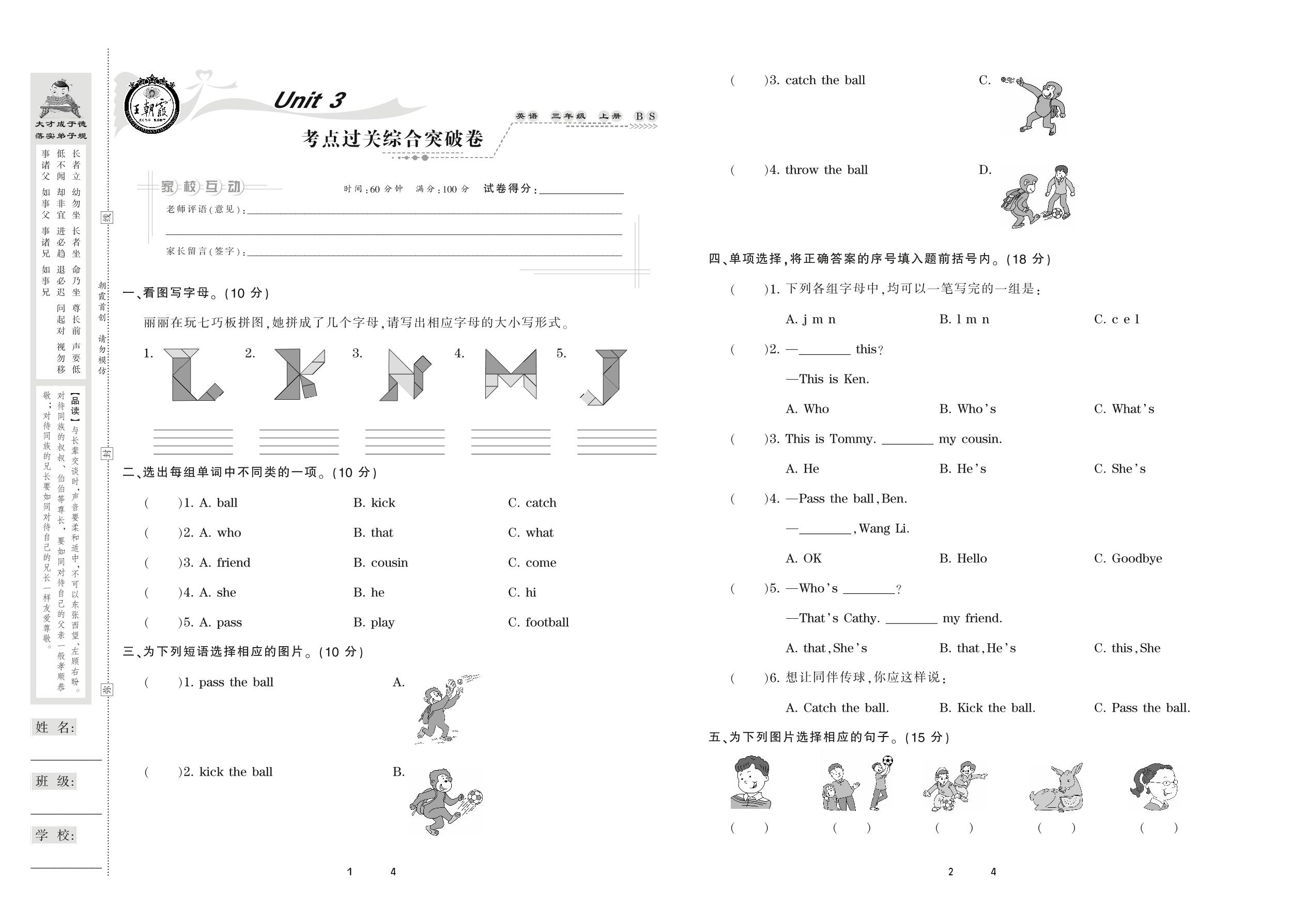 2020上册三年级英语北师版 Unit 3 考点过关综合突破卷