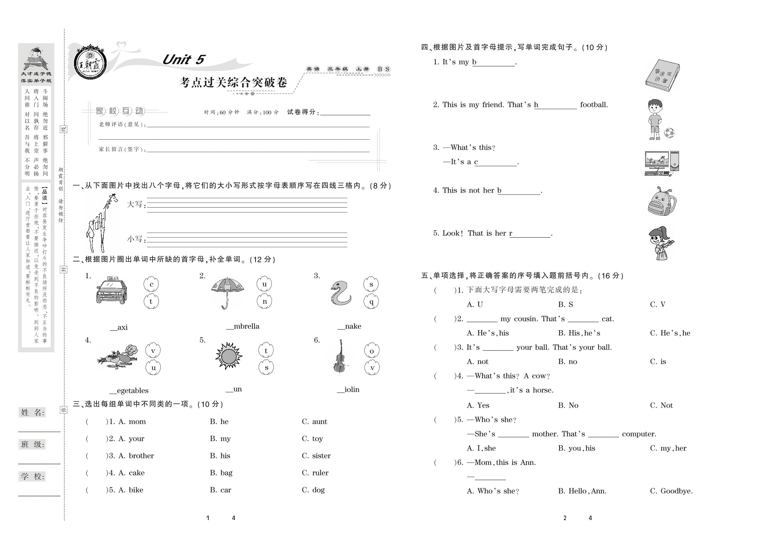 2020上册三年级英语北师版 Unit 5 考点过关综合突破卷