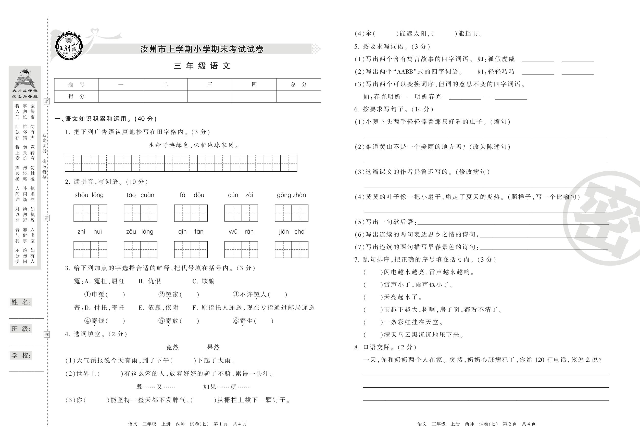 2016-2017学年第一学期汝州市三年级语文试卷(西师版)【7】
