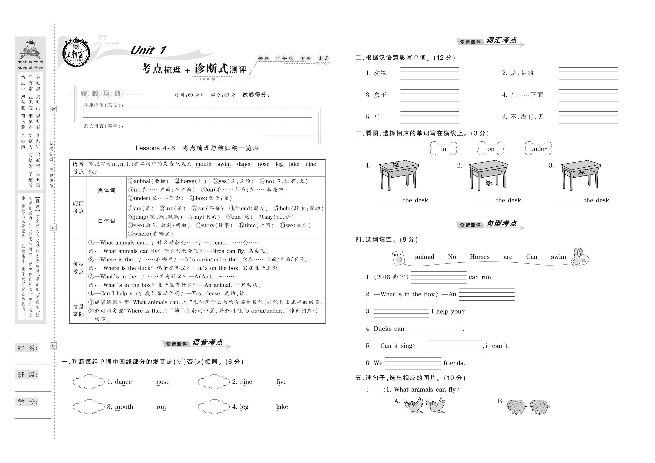 2021下册三年级英语冀教版 Unit 1 考点梳理+诊断式测评 Lessons 4-6