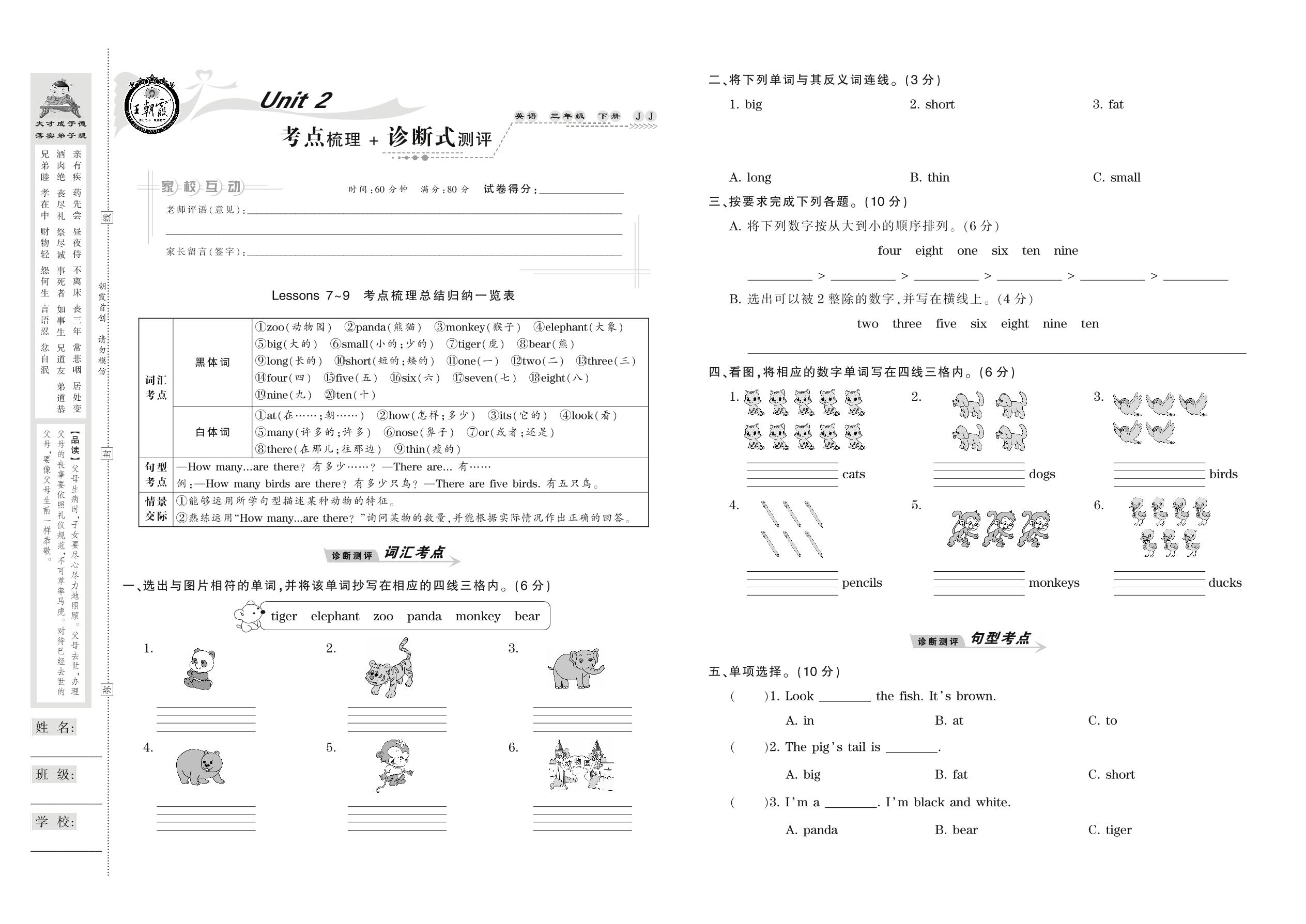 2021下册三年级英语冀教版 Unit 2 考点梳理+诊断式测评 Lessons 7-9