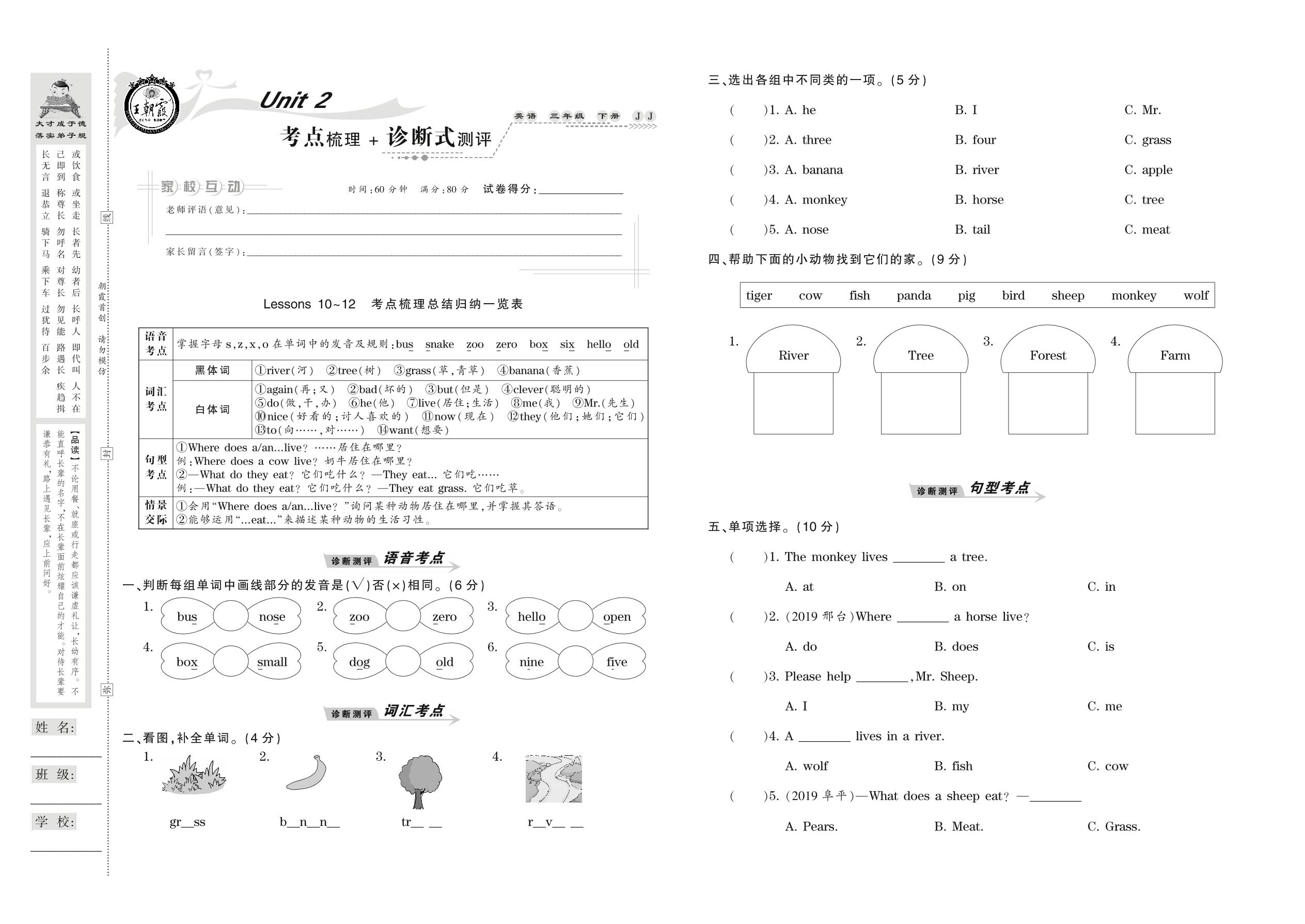 2021下册三年级英语冀教版 Unit 2 考点梳理+诊断式测评 Lessons 10-12