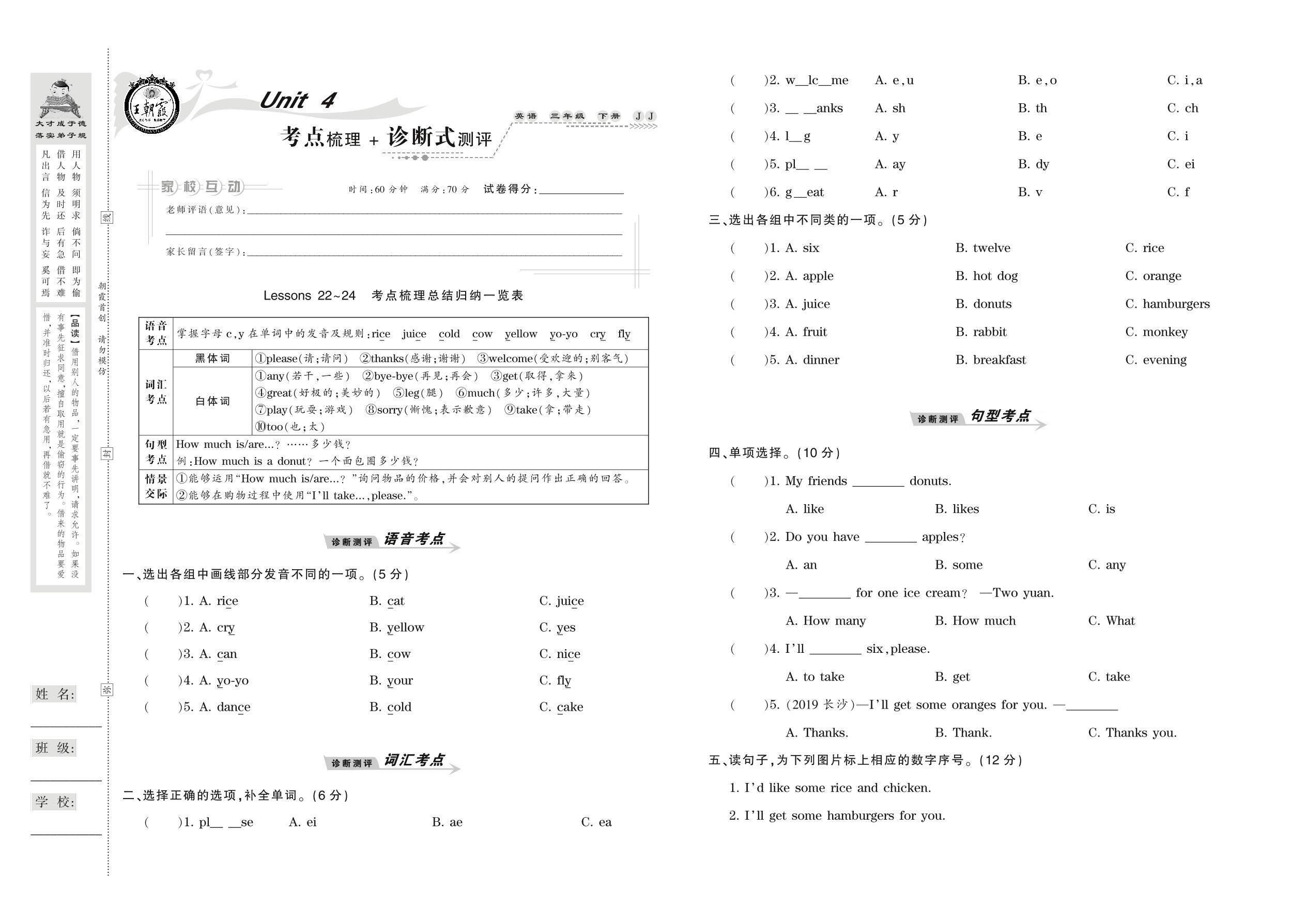 2021下册三年级英语冀教版 Unit 4 考点梳理+诊断式测评 Lessons 22-24